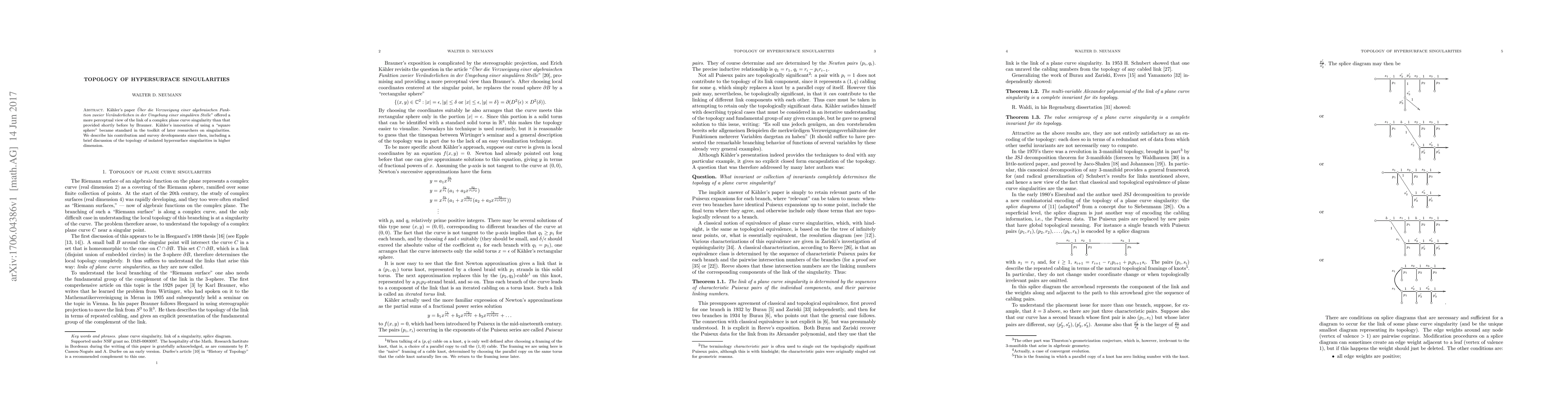 The paper surveys developments in the topology of hypersurface singularities, building upon Kähler's contribution using a 'square sphere' approach to understand singularities of complex plane curves.