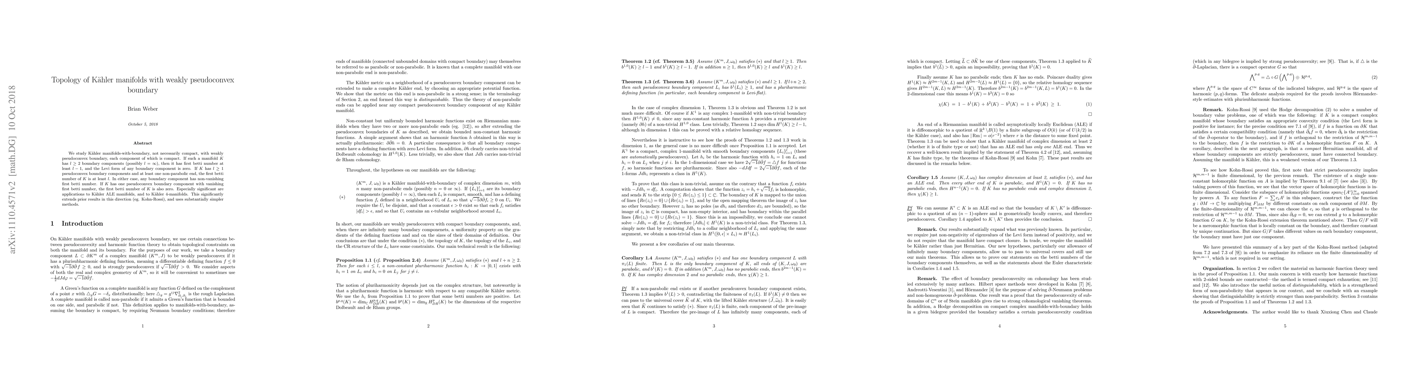 We study Kahler manifolds-with-boundary, not necessarily compact, with weakly pseudoconvex boundary, each component of which is compact. If such a manifold $K$ has $l\ge2$ boundary components (possibly $l=\infty$), then it has first betti number at least $l-1$, and the Levi form of any boundary component is zero. If $K$ has $l\ge1$ pseudoconvex boundary components and at least one non-parabolic end, the first betti number of $K$ is at least $l$. In either case, any boundary component has non-vanishing first betti number. If $K$ has one pseudoconvex boundary component with vanishing first betti number, the first betti number of $K$ is also zero. Especially significant are applications to Kahler ALE manifolds, and to Kahler 4-manifolds. This significantly extends prior results in this direction (eg. Kohn-Rossi), and uses substantially simpler methods.