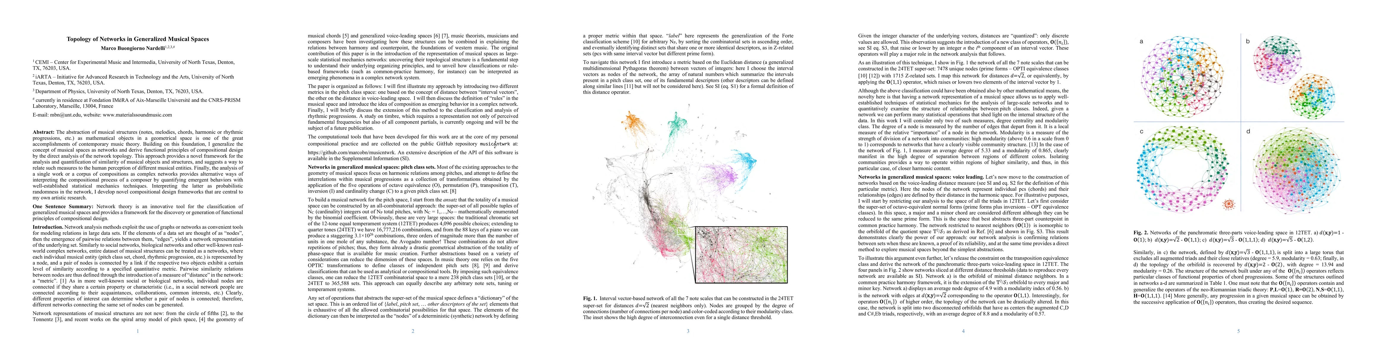 The abstraction of musical structures (notes, melodies, chords, harmonic or rhythmic progressions, etc.) as mathematical objects in a geometrical space is one of the great accomplishments of contemporary music theory. Building on this foundation, I generalize the concept of musical spaces as networks and derive functional principles of compositional design by the direct analysis of the network topology. This approach provides a novel framework for the analysis and quantification of similarity of musical objects and structures, and suggests a way to relate such measures to the human perception of different musical entities. Finally, the analysis of a single work or a corpus of compositions as complex networks provides alternative ways of interpreting the compositional process of a composer by quantifying emergent behaviors with well-established statistical mechanics techniques. Interpreting the latter as probabilistic randomness in the network, I develop novel compositional design frameworks that are central to my own artistic research.