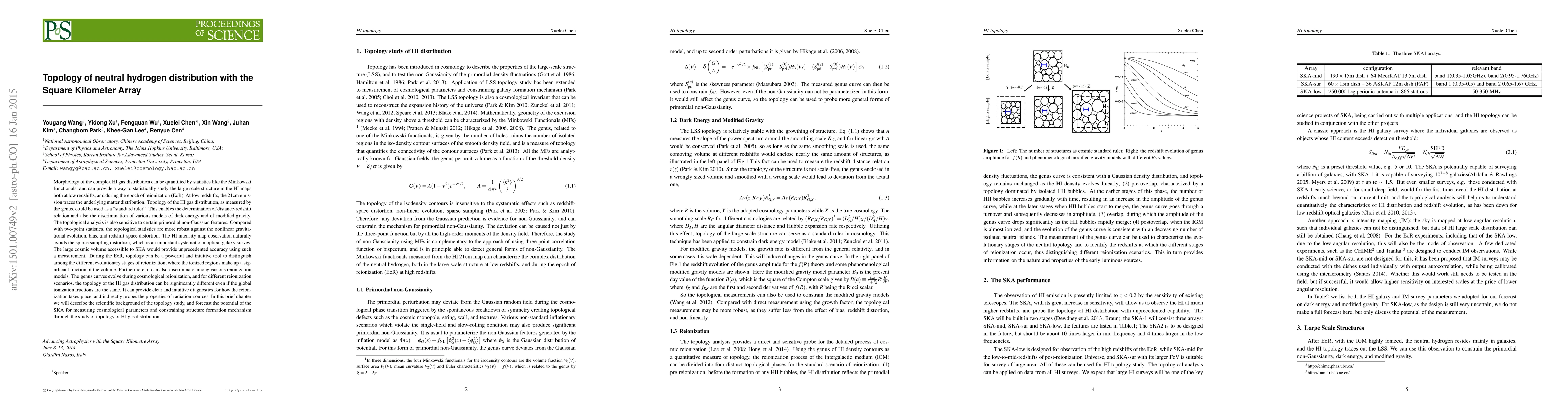 Morphology of the complex HI gas distribution can be quantified by statistics like the Minkowski functionals, and can provide a way to statistically study the large scale structure in the HI maps both at low redshifts, and during the epoch of reionization (EoR). At low redshifts, the 21cm emission traces the underlying matter distribution. Topology of the HI gas distribution, as measured by the genus, could be used as a "standard ruler". This enables the determination of distance-redshift relation and also the discrimination of various models of dark energy and of modified gravity. The topological analysis is also sensitive to certain primordial non-Gaussian features. Compared with two-point statistics, the topological statistics are more robust against the nonlinear gravitational evolution, bias, and redshift-space distortion. The HI intensity map observation naturally avoids the sparse sampling distortion, which is an important systematic in optical galaxy survey. The large cosmic volume accessible to SKA would provide unprecedented accuracy using such a measurement... [abridged]