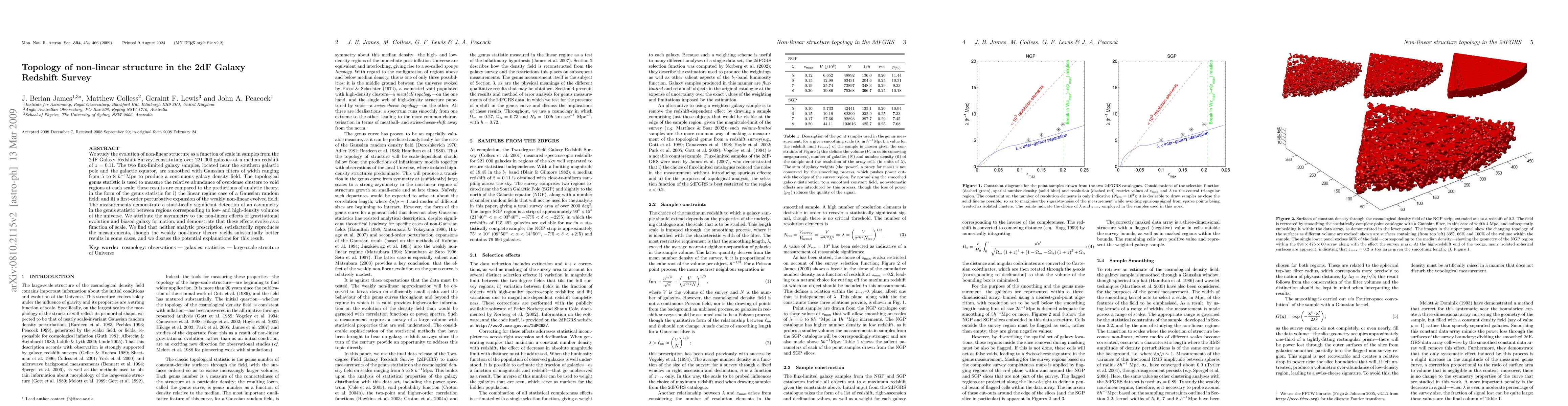 We study the evolution of non-linear structure as a function of scale in samples from the 2dF Galaxy Redshift Survey, constituting over 221 000 galaxies at a median redshift of z=0.11. The two flux-limited galaxy samples, located near the southern galactic pole and the galactic equator, are smoothed with Gaussian filters of width ranging from 5 to 8 Mpc/h to produce a continuous galaxy density field. The topological genus statistic is used to measure the relative abundance of overdense clusters to void regions at each scale; these results are compared to the predictions of analytic theory, in the form of the genus statistic for i) the linear regime case of a Gaussian random field; and ii) a first-order perturbative expansion of the weakly non-linear evolved field. The measurements demonstrate a statistically significant detection of an asymmetry in the genus statistic between regions corresponding to low- and high-density volumes of the universe. We attribute the asymmetry to the non-linear effects of gravitational evolution and biased galaxy formation, and demonstrate that these effects evolve as a function of scale. We find that neither analytic prescription satisfactorily reproduces the measurements, though the weakly non-linear theory yields substantially better results in some cases, and we discuss the potential explanations for this result.