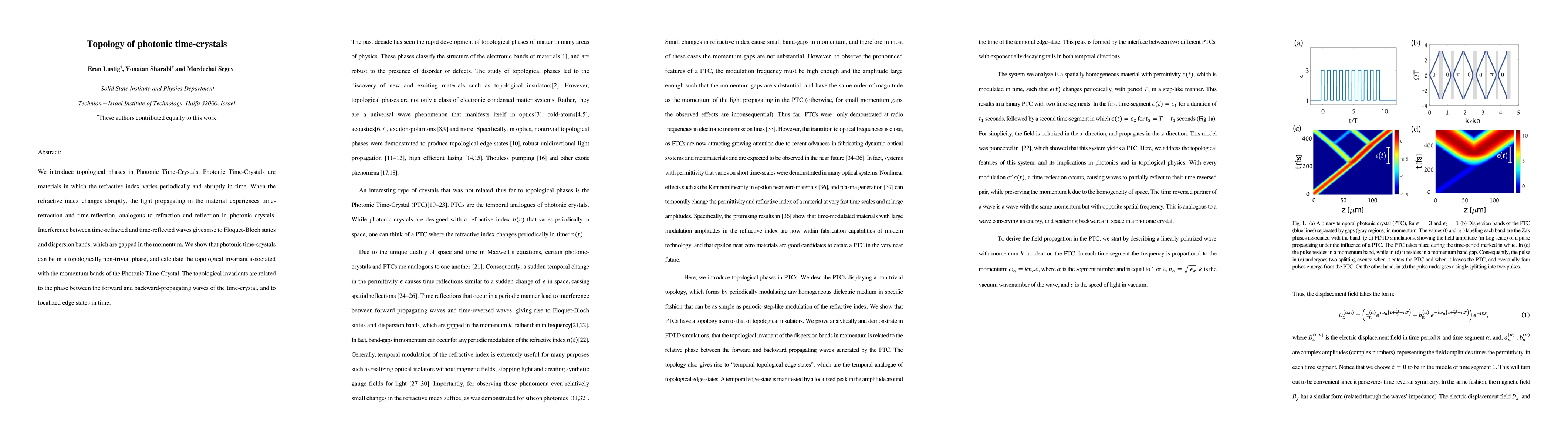 This paper introduces topological phases in Photonic Time-Crystals, which periodically vary the refractive index in time, leading to time-refraction and reflection effects. The study reveals topologically non-trivial phases and calculates the associated topological invariant, linking it to localized edge states and the phase differences between forward and backward-propagating waves.