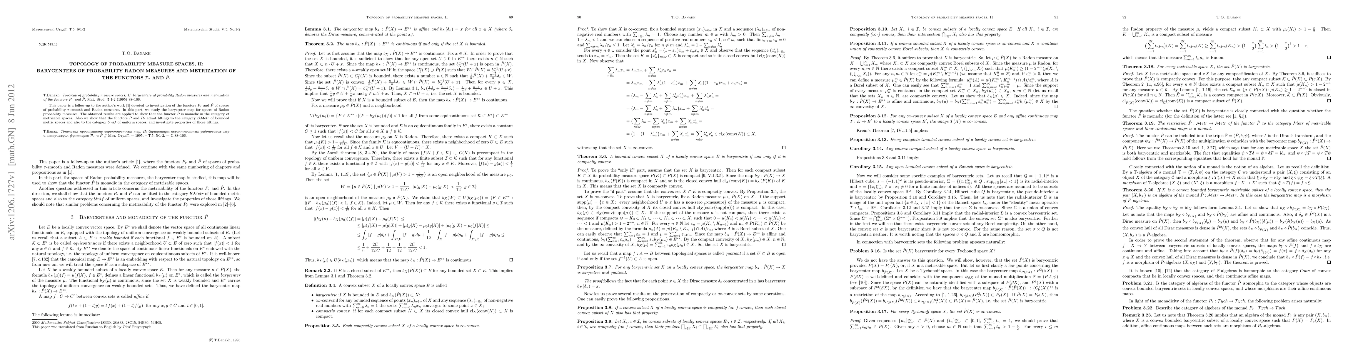 This paper investigates the barycenter map for spaces of Radon probability measures and demonstrates that the functor $\hat P$ is monadic in the category of metrizable spaces. It also shows that functors $\hat P$ and $P_\tau$ can be lifted to bounded metric spaces and uniform spaces, exploring their properties.