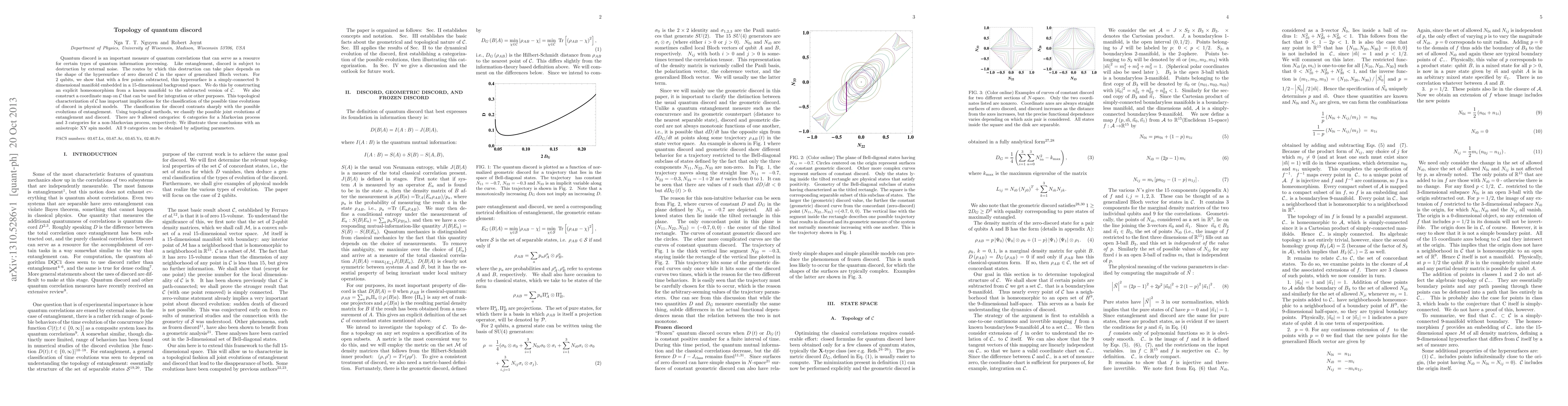 Quantum discord is an important measure of quantum correlations that can serve as a resource for certain types of quantum information processing. \ Like entanglement, discord is subject to destruction by external noise. The routes by which this destruction can take place depends on the shape of the hypersurface of zero discord $\mathcal{C}$ in the space of generalized Bloch vectors. For 2 qubits, we show that with a few points subtracted, this hypersurface is a simply-connected 9-dimensional manifold embedded in a 15-dimensional background space. \ We do this by constructing an explicit\ homeomorphism from a known manifold to the subtracted version of $\mathcal{C} $. We also construct a coordinate map on $\mathcal{C}$ that can be used for integration or other purposes. This topological characterization of $% \mathcal{C}$ has important implications for the classification of the possible time evolutions of discord in physical models. The classification for discord contrasts sharply with the possible evolutions of entanglement. Using topological methods, we classify the possible joint evolutions of entanglement and discord. There are 9 allowed categories: 6 categories for a Markovian process and 3 categories for a non-Markovian process, respectively. We illustrate these conclusions with an anisotropic XY spin model. All 9 categories can be obtained by adjusting parameters.