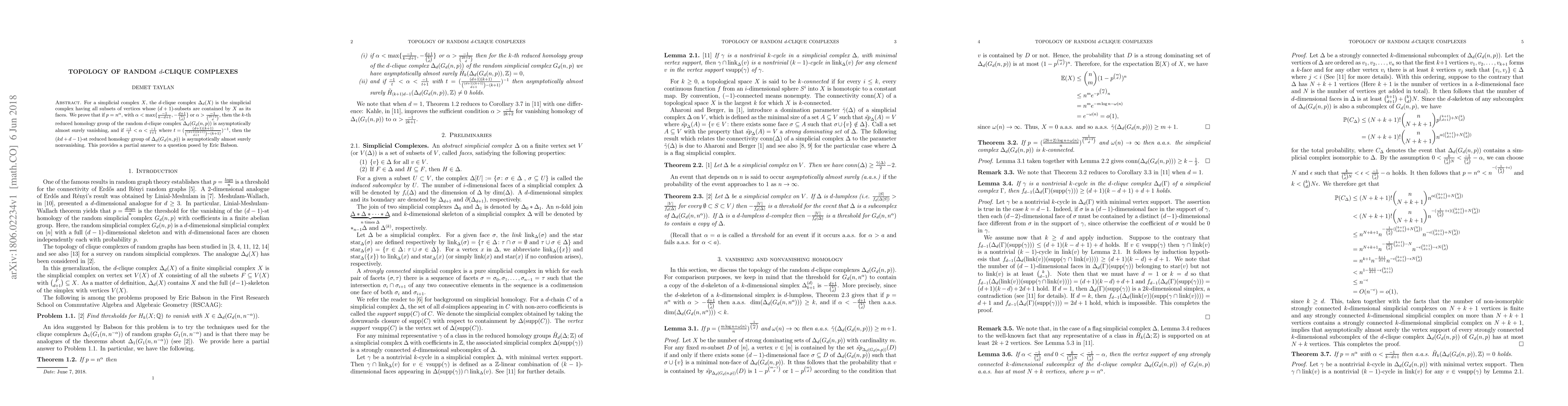 For a simplicial complex $X$, the $d$-clique complex $\Delta_d(X)$ is the simplicial complex having all subsets of vertices whose $(d + 1)$-subsets are contained by $X$ as its faces. We prove that if $p = n^{\alpha}$, with $\alpha < \max\{\frac{-1}{k-d +1},-\frac{d+1}{\binom{k}{d}}\}$ or $\alpha > \frac{-1}{\binom{2k+2}{d}}$, then the $k$-th reduced homology group of the random $d$-clique complex $\Delta_d(G_d(n,p))$ is asymptotically almost surely vanishing, and if $\frac{-1}{t} < \alpha < \frac{-1}{t+1}$ where $t = (\frac{(d+1)(k+1)}{\binom{(d+1)(k+1)}{d+1}-(k+1)})^{-1}$, then the $(kd + d -1)$-st reduced homology group of $\Delta_d(G_d(n,p))$ is asymptotically almost surely nonvanishing. This provides a partial answer to a question posed by Eric Babson.
