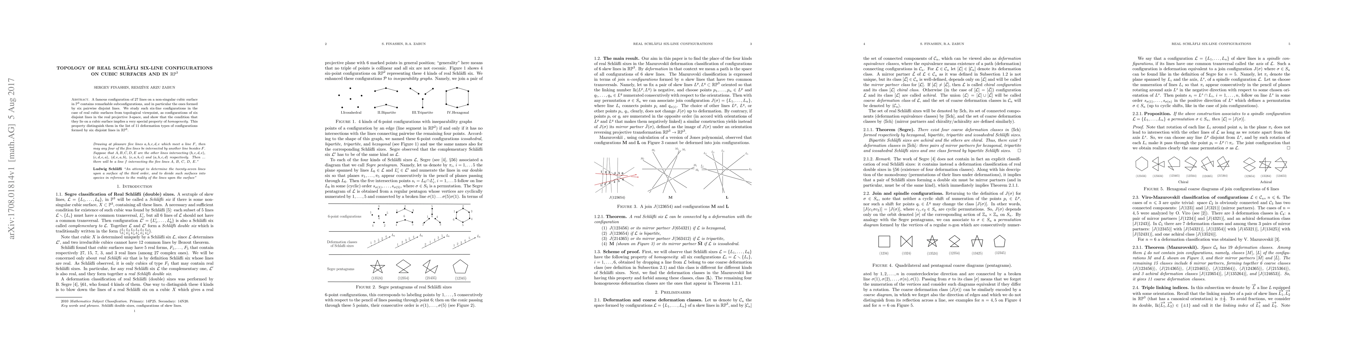 A famous configuration of 27 lines on a non-singular cubic surface in $\mathbb P^3$ contains remarkable subconfigurations, and in particular the ones formed by six pairwise disjoint lines. We study such six-line configurations in the case of real cubic surfaces from topological viewpoint, as configurations of six disjoint lines in the real projective 3-space, and show that the condition that they lie on a cubic surface implies a very special property of {\it homogeneity}. This property distinguish them in the list of 11 deformation types of configurations formed by six disjoint lines in $\mathbb{RP}^3$.
