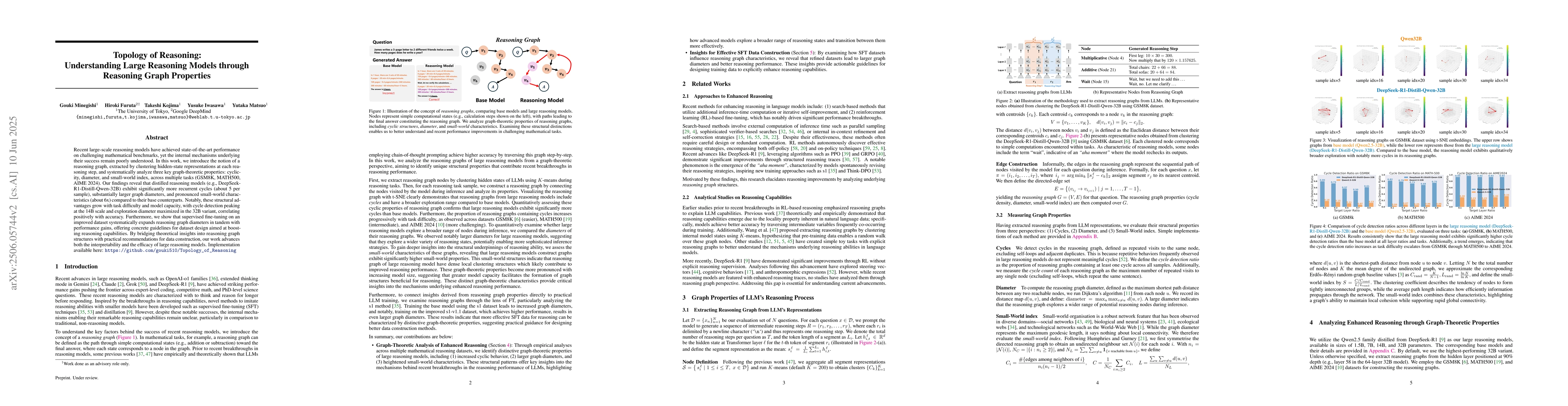 Recent large-scale reasoning models have achieved state-of-the-art performance on challenging mathematical benchmarks, yet the internal mechanisms underlying their success remain poorly understood. In this work, we introduce the notion of a reasoning graph, extracted by clustering hidden-state representations at each reasoning step, and systematically analyze three key graph-theoretic properties: cyclicity, diameter, and small-world index, across multiple tasks (GSM8K, MATH500, AIME 2024). Our findings reveal that distilled reasoning models (e.g., DeepSeek-R1-Distill-Qwen-32B) exhibit significantly more recurrent cycles (about 5 per sample), substantially larger graph diameters, and pronounced small-world characteristics (about 6x) compared to their base counterparts. Notably, these structural advantages grow with task difficulty and model capacity, with cycle detection peaking at the 14B scale and exploration diameter maximized in the 32B variant, correlating positively with accuracy. Furthermore, we show that supervised fine-tuning on an improved dataset systematically expands reasoning graph diameters in tandem with performance gains, offering concrete guidelines for dataset design aimed at boosting reasoning capabilities. By bridging theoretical insights into reasoning graph structures with practical recommendations for data construction, our work advances both the interpretability and the efficacy of large reasoning models.