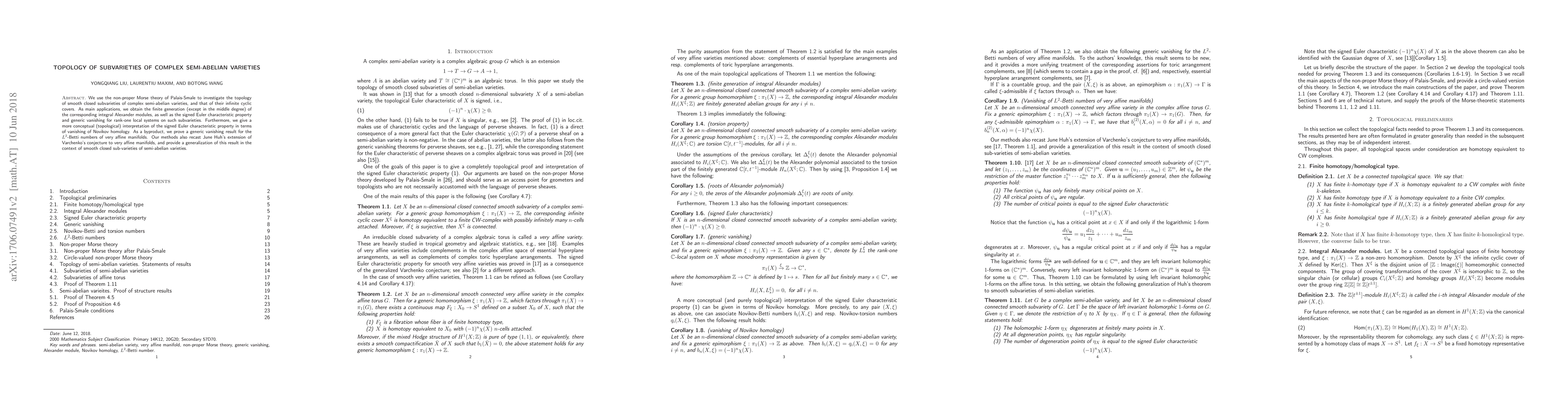 This research applies non-proper Morse theory to study the topology of smooth closed subvarieties in complex semi-abelian varieties and their infinite cyclic covers, proving finite generation of integral Alexander modules and establishing properties like the signed Euler characteristic and generic vanishing for rank-one local systems. It also connects these findings to Novikov homology and $L^2$-Betti numbers, extending Varchenko's conjecture for very affine manifolds.