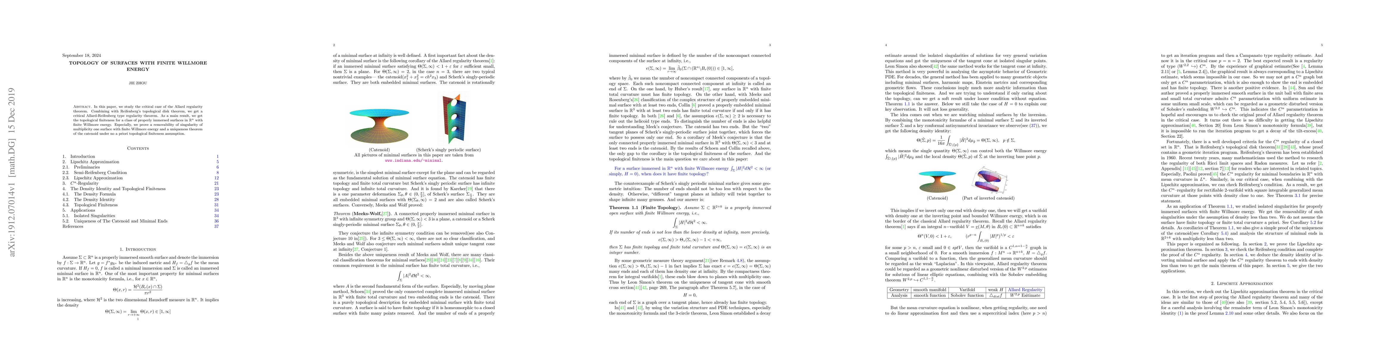 In this paper, we study the critical case of the Allard regularity theorem. Combining with Reifenberg's topological disk theorem, we get a critical Allard-Reifenberg type regularity theorem. As a main result, we get the topological finiteness for a class of properly immersed surfaces in $\mathbb{R}^n$ with finite Willmore energy. Especially, we prove a removability of singularity of multiplicity one surface with finite Willmore energy and a uniqueness theorem of the catenoid under no a priori topological finiteness assumption.
