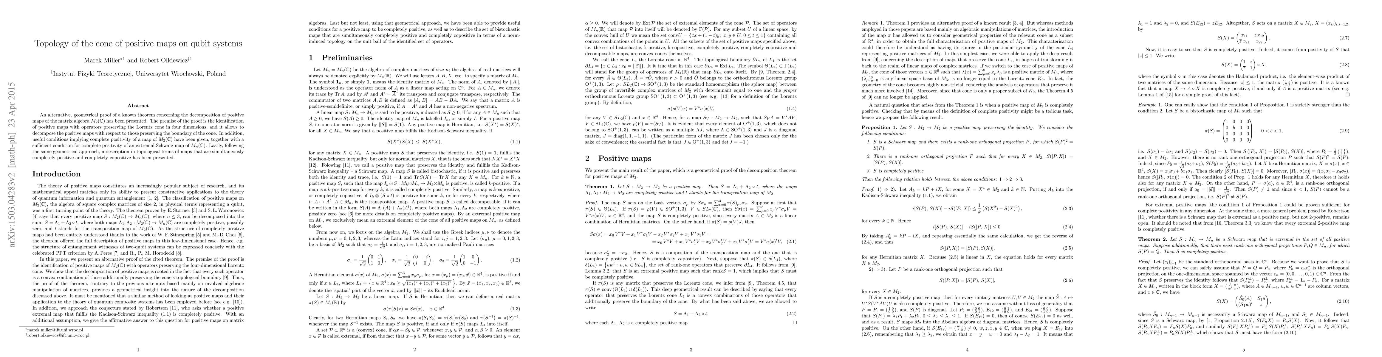 An alternative, geometrical proof of a known theorem concerning the decomposition of positive maps of the matrix algebra $M_{2}(\mathbb{C})$ has been presented. The premise of the proof is the identification of positive maps with operators preserving the Lorentz cone in four dimensions, and it allows to decompose the positive maps with respect to those preserving the boundary of the cone. In addition, useful conditions implying complete positivity of a map of $M_{2}(\mathbb{C})$ have been given, together with a sufficient condition for complete positivity of an extremal Schwarz map of $M_{n}(\mathbb{C})$. Lastly, following the same geometrical approach, a description in topological terms of maps that are simultaneously completely positive and completely copositive has been presented.