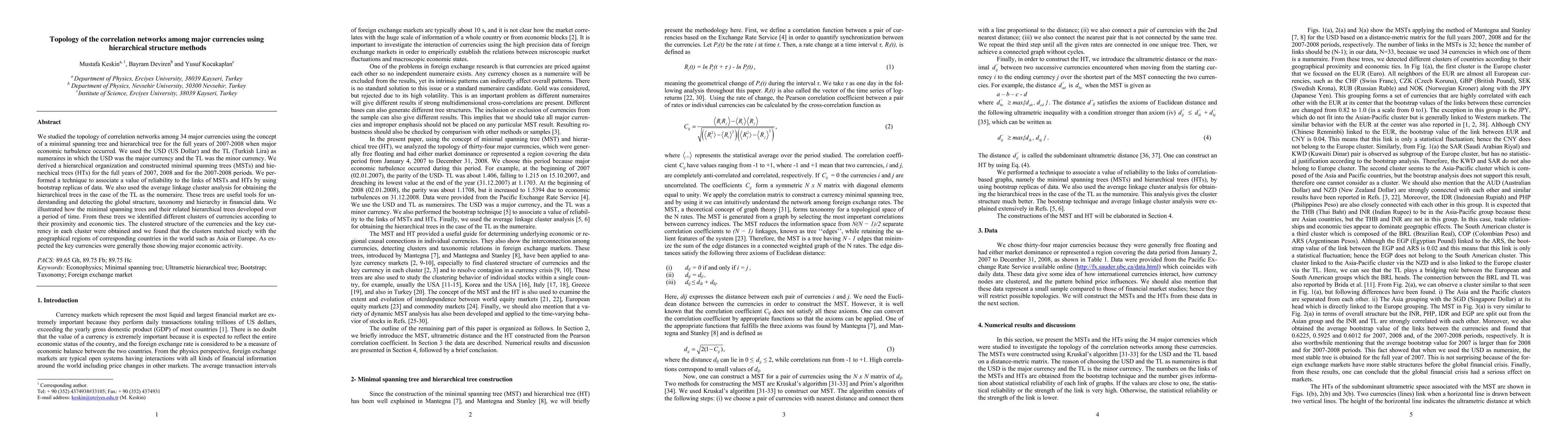 We studied the topology of correlation networks among 34 major currencies using the concept of a minimal spanning tree and hierarchical tree for the full years of 2007-2008 when major economic turbulence occurred. We used the USD (US Dollar) and the TL (Turkish Lira) as numeraires in which the USD was the major currency and the TL was the minor currency. We derived a hierarchical organization and constructed minimal spanning trees (MSTs) and hierarchical trees (HTs) for the full years of 2007, 2008 and for the 2007-2008 periods. We performed a technique to associate a value of reliability to the links of MSTs and HTs by using bootstrap replicas of data. We also used the average linkage cluster analysis for obtaining the hierarchical trees in the case of the TL as the numeraire. These trees are useful tools for understanding and detecting the global structure, taxonomy and hierarchy in financial data. We illustrated how the minimal spanning trees and their related hierarchical trees developed over a period of time. From these trees we identified different clusters of currencies according to their proximity and economic ties. The clustered structure of the currencies and the key currency in each cluster were obtained and we found that the clusters matched nicely with the geographical regions of corresponding countries in the world such as Asia or Europe. As expected the key currencies were generally those showing major economic activity.