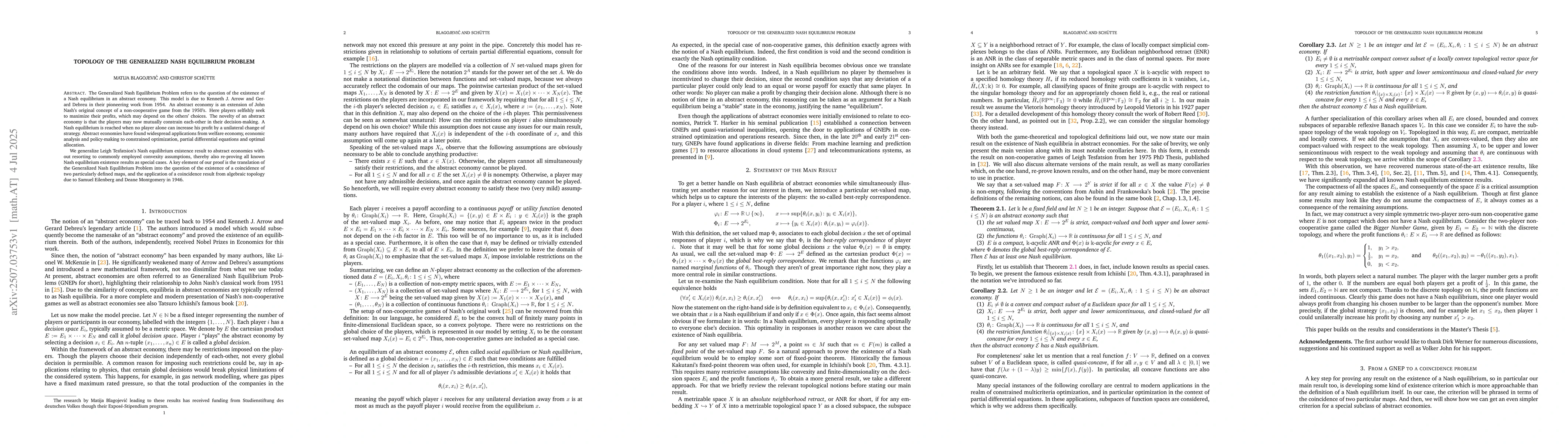 The Generalized Nash Equilibrium Problem refers to the question of the existence of a Nash equilibrium in an abstract economy. This model is due to Kenneth J. Arrow and Gerard Debreu in their pioneering work from 1954. An abstract economy is an extension of John Nash's original concept of a non-cooperative game from the 1950's. Here players selfishly seek to maximize their profits, which may depend on the others' choices. The novelty of an abstract economy is that the players may now mutually constrain each-other in their decision-making. A Nash equilibrium is reached when no player alone can increase his profit by a unilateral change of strategy. Abstract economies have found widespread applications from welfare economy, economic analysis and policy-making to constrained optimization, partial differential equations and optimal allocation. We generalize Leigh Tesfatsion's Nash equilibrium existence result to abstract economies without resorting to commonly employed convexity assumptions, thereby also re-proving all known Nash equilibrium existence results as special cases. A key element of our proof is the translation of the Generalized Nash Equilibrium Problem into the question of the existence of a coincidence of two particularly defined maps, and the application of a coincidence result from algebraic topology due to Samuel Eilenberg and Deane Montgomery in 1946.
