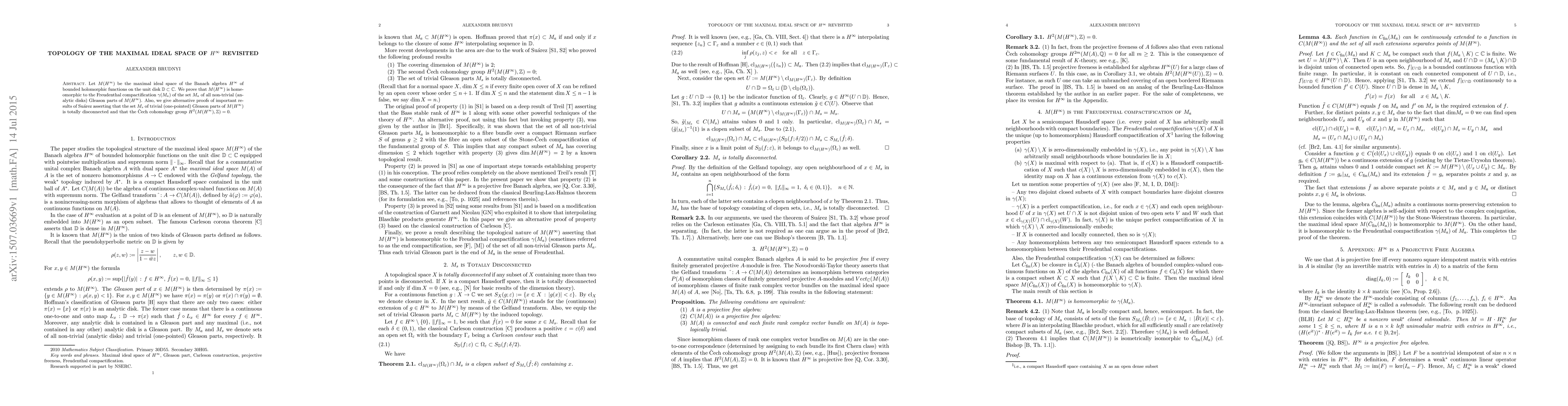 The paper revisits and proves several topological properties of the maximal ideal space of the Banach algebra $H^\infty$ using advanced techniques from Banach algebra theory, cohomology, and complex analysis.