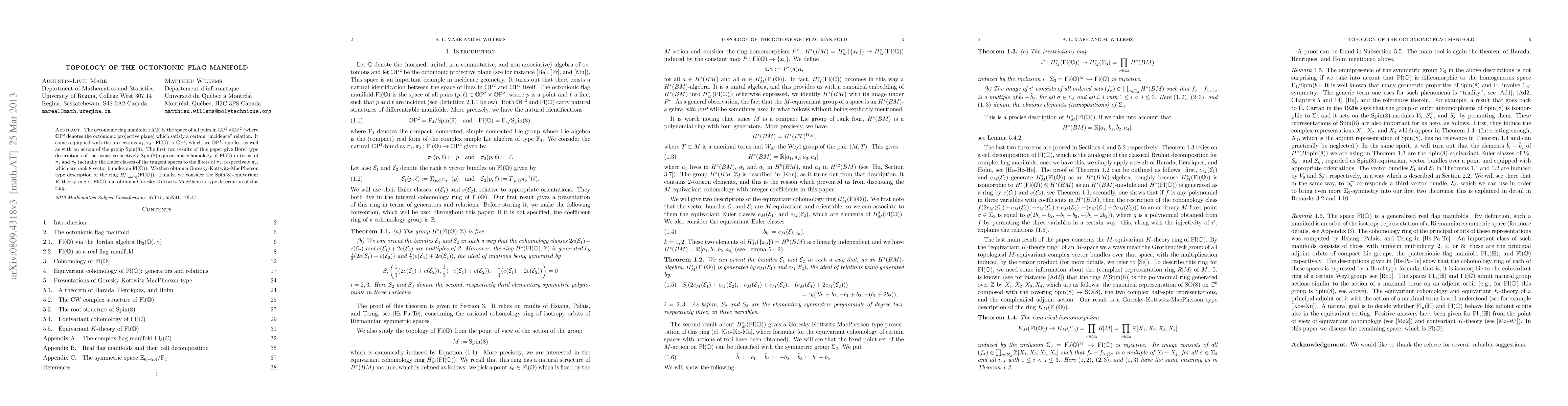 The octonionic flag manifold $Fl(\mathbb{O})$ is the space of all pairs in $\mathbb{O}P^2\times \mathbb{O}P^2$ (where $\mathbb{O}P^2$ denotes the octonionic projective plane) which satisfy a certain "incidence" relation. It comes equipped with the projections $\pi_1,\pi_2 : Fl(\mathbb{O})\to \mathbb{O}P^2$, which are $\mathbb{O}P^1$ bundles, as well as with an action of the group $Spin(8)$. The first two results of this paper give Borel type descriptions of the usual, respectively $Spin(8)$-equivariant cohomology of $Fl(\mathbb{O})$ in terms of $\pi_1$ and $\pi_2$ (actually the Euler classes of the tangent spaces to the fibers of $\pi_1$, respectively $\pi_2$, which are rank 8 vector bundles on $Fl(\mathbb{O})$). Then we obtain a Goresky-Kottwitz-MacPherson type description of the ring $H^*_{Spin(8)}(Fl(\mathbb{O}))$. Finally, we consider the $Spin(8)$-equivariant $K$-theory ring of $Fl(\mathbb{O})$ and obtain a Goresky-Kottwitz-MacPherson type description of this ring.