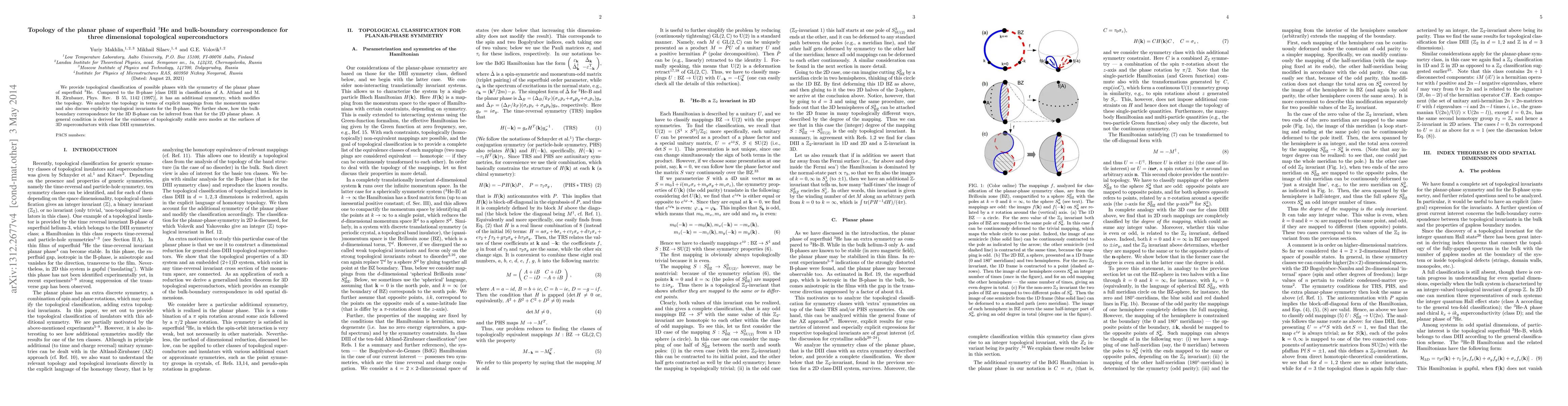 We provide topological classification of possible phases with the symmetry of the planar phase of superfluid $^3$He. Compared to the B-phase (class DIII in classification of Altland and Zirnbauer), it has an additional symmetry, which modifies the topology. We analyze the topology in terms of explicit mappings from the momentum space and also discuss explicitly topological invariants for the B-phase. We further show, how the bulk-boundary correspondence for the 3D B-phase can be inferred from that for the 2D planar phase. A general condition is derived for the existence of topologically stable zero modes at the surfaces of 3D superconductors with class DIII symmetries.