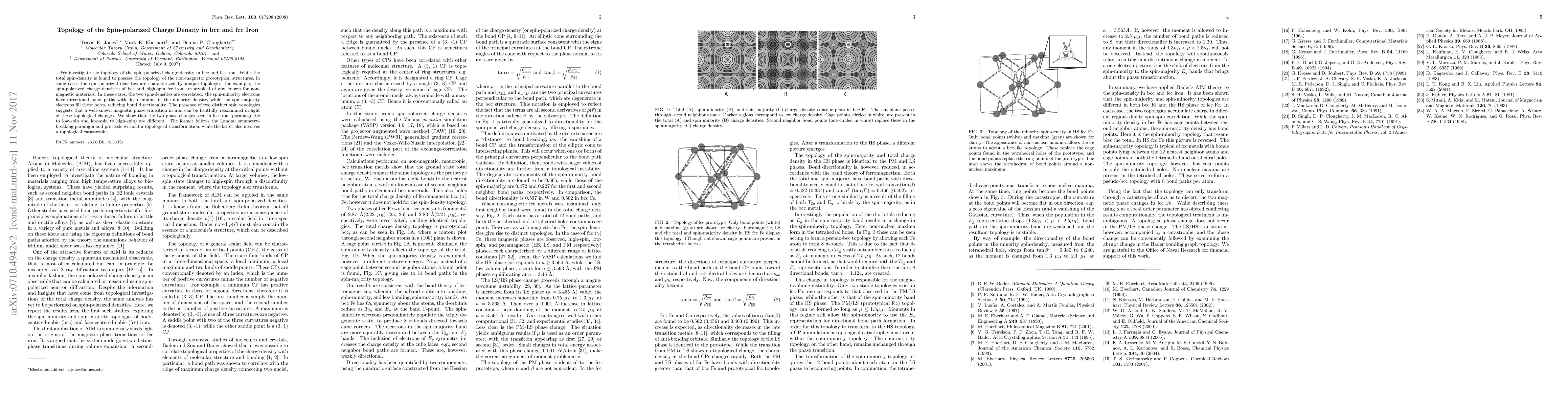 We investigate the topology of the spin-polarized charge density in bcc and fcc iron. While the total spin-density is found to possess the topology of the non-magnetic prototypical structures, in some cases the spin-polarized densities are characterized by unique topologies; for example, the spin-polarized charge densities of bcc and high-spin fcc iron are atypical of any known for non-magnetic materials. In these cases, the two spin-densities are correlated: the spin-minority electrons have directional bond paths with deep minima in the minority density, while the spin-majority electrons fill these holes, reducing bond directionality. The presence of two distinct spin topologies suggests that a well-known magnetic phase transition in iron can be fruitfully reexamined in light of these topological changes. We show that the two phase changes seen in fcc iron (paramagnetic to low-spin and low-spin to high-spin) are different. The former follows the Landau symmetry-breaking paradigm and proceeds without a topological transformation, while the latter also involves a topological catastrophe.