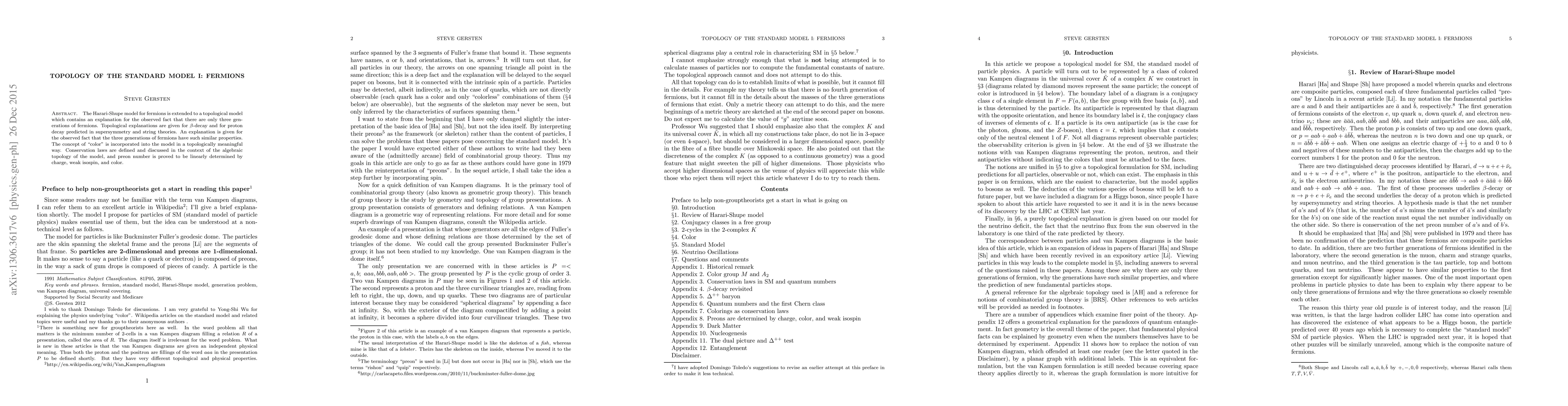 The Harari-Shupe model for fermions is extended to a topological model which contains an explanation for the observed fact that there are only three generations of fermions. Topological explanations are given for $\beta$-decay and for proton decay predicted in supersymmetry and string theories. An explanation is given for the observed fact that the three generations of fermions have such similar properties. The concept of "color" is incorporated into the model in a topologically meaningful way. Conservation laws are defined and discussed in the context of the algebraic topology of the model, and preon number is proved to be linearly determined by charge, weak isospin, and color.