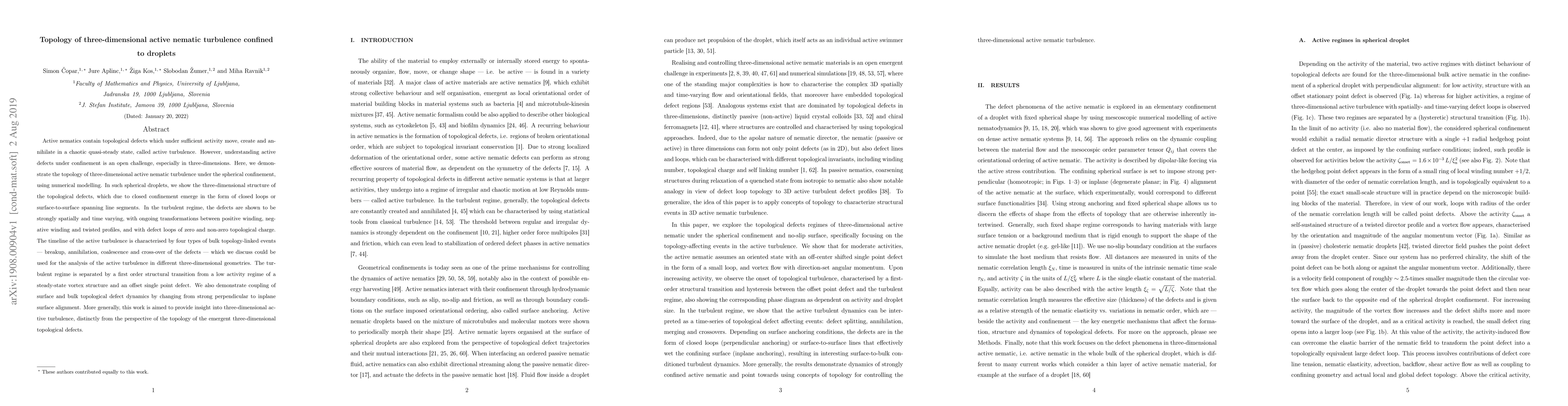 This research investigates the topology of three-dimensional active nematic turbulence within spherical droplets using numerical modeling. It reveals the dynamic, complex behavior of topological defects, including their transformations and interactions, and identifies four key topological events characterizing the turbulent regime.