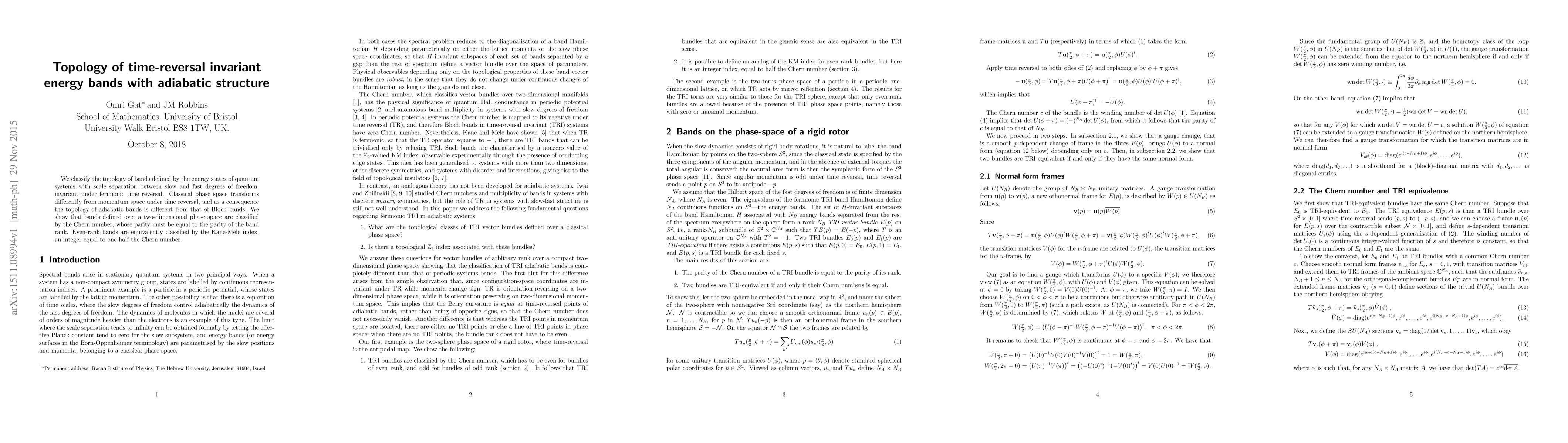 We classify the topology of bands defined by the energy states of quantum systems with scale separation between slow and fast degrees of freedom, invariant under fermionic time reversal. Classical phase space transforms differently from momentum space under time reversal, and as a consequence the topology of adiabatic bands is different from that of Bloch bands. We show that bands defined over a two-dimensional phase space are classified by the Chern number, whose parity must be equal to the parity of the band rank. Even-rank bands are equivalently classified by the Kane-Mele index, an integer equal to one half the Chern number.