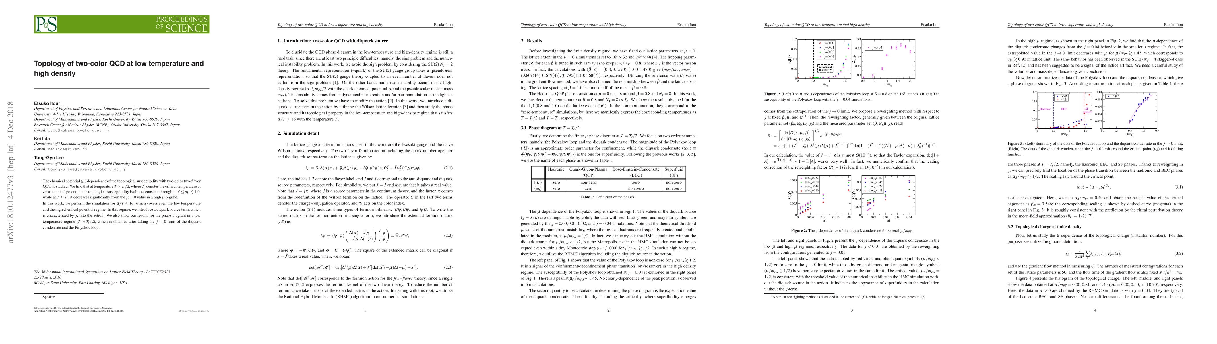 The chemical potential ($\mu$) dependence of the topological susceptibility with two-color two-flavor QCD is studied. We find that at temperature $T \approx T_c /2$, where $T_c$ denotes the critical temperature at zero chemical potential, the topological susceptibility is almost constant throughout $0 \leq a\mu \lesssim 1.0$, while at $T\approx T_c$, it decreases significantly from the $\mu=0$ value in a high $\mu$ regime. In this work, we perform the simulation for $\mu/T \le 16$, which covers even the low temperature and the high chemical potential regime. In this regime, we introduce a diquark source term, which is characterized by $j$, into the action. We also show our results for the phase diagram in a low temperature regime ($T\approx T_c/2$), which is obtained after taking the $j \to 0$ limit of the diquark condensate and the Polyakov loop.