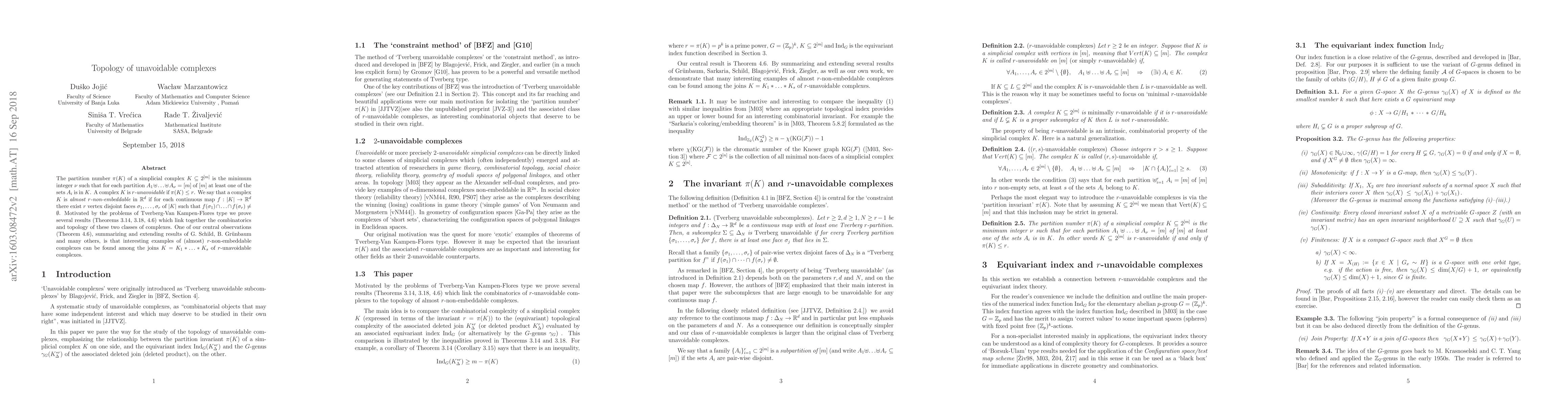 The partition number $\pi(K)$ of a simplicial complex $K\subset 2^{[m]}$ is the minimum integer $\nu$ such that for each partition $A_1\uplus\ldots\uplus A_\nu = [m]$ of $[m]$ at least one of the sets $A_i$ is in $K$. A complex $K$ is $r$-unavoidable if $\pi(K)\leq r$. We say that a complex $K$ is globally $r$-non-embeddable in $\mathbb{R}^d$ if for each continuous map $f: | K| \rightarrow \mathbb{R}^d$ there exist $r$ vertex disjoint faces $\sigma_1,\ldots, \sigma_r$ of $| K|$ such that $f(\sigma_1)\cap\ldots\cap f(\sigma_r)\neq\emptyset$. Motivated by the problems of Tverberg-Van Kampen-Flores type we prove several results (Theorems 3.6, 3.9, 4.6) which link together the combinatorics and topology of these two classes of complexes. One of our central observations (Theorem 4.6), summarizing and extending results of G. Schild, B. Gr\"{u}nbaum and many others, is that interesting examples of (globally) $r$-non-embeddable complexes can be found among the joins $K = K_1\ast\ldots\ast K_s$ of $r$-unavoidable complexes.