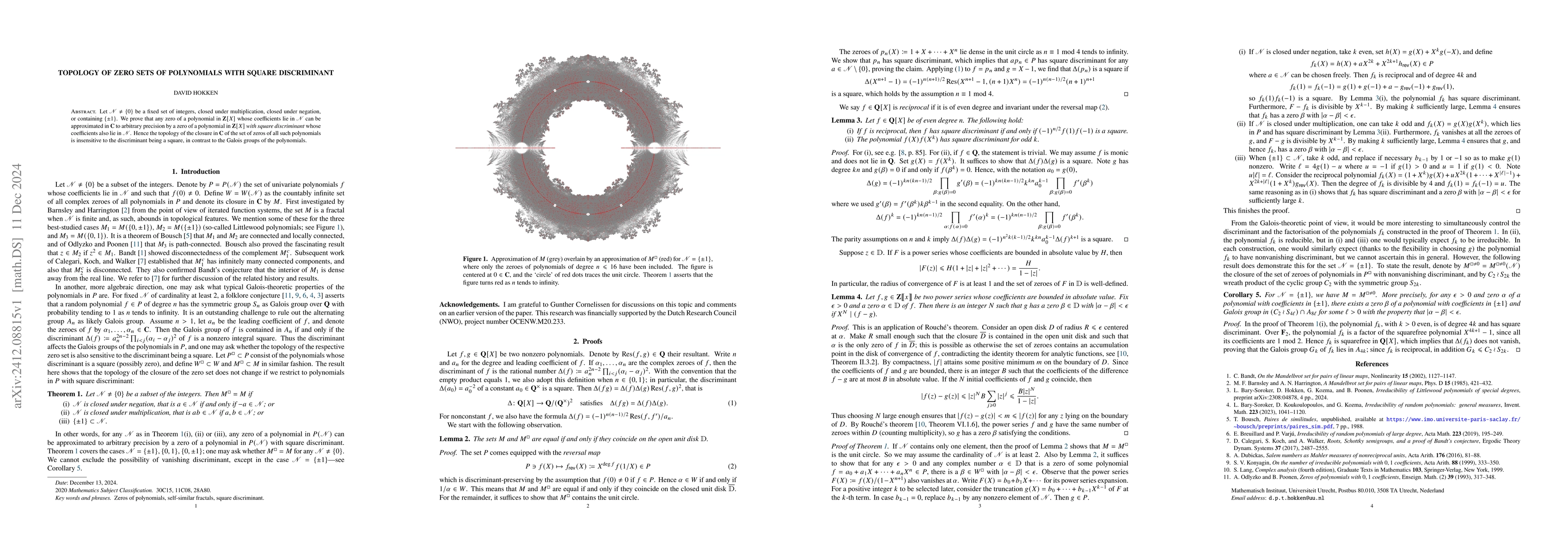 Summary: This paper proves that zeros of polynomials with integer coefficients from a specified set can be approximated by zeros of polynomials with square discriminants from the same set, demonstrating that the topological closure of these zeros remains unchanged regardless of discriminant properties.