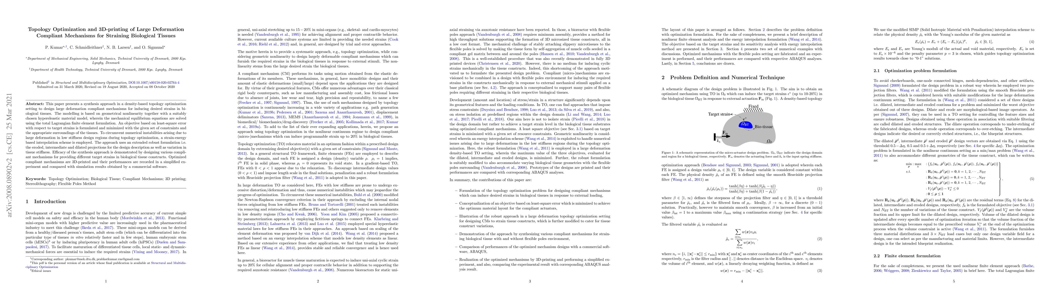 This paper presents a synthesis approach in a density-based topology optimization setting to design large deformation compliant mechanisms for inducing desired strains in biological tissues. The modelling is based on geometrical nonlinearity together with a suitably chosen hypereleastic material model, wherein the mechanical equilibrium equations are solved using the total Lagrangian finite element formulation. An objective based on least-square error with respect to target strains is formulated and minimized with the given set of constraints and the appropriate surroundings of the tissues. To circumvent numerical instabilities arising due to large deformation in low stiffness design regions during topology optimization, a strain-energy based interpolation scheme is employed. The approach uses an extended robust formulation i.e. the eroded, intermediate and dilated projections for the design description as well as variation in tissue stiffness. Efficacy of the synthesis approach is demonstrated by designing various compliant mechanisms for providing different target strains in biological tissue constructs. Optimized compliant mechanisms are 3D-printed and their performances are recorded in a simplified experiment and compared with simulation results obtained by a commercial software.