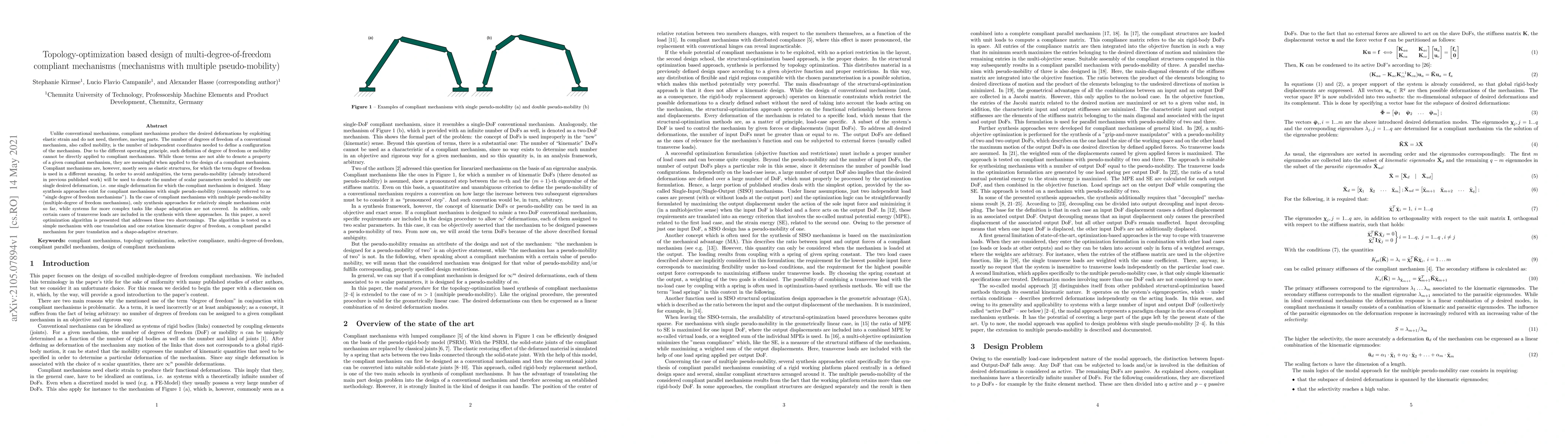 Unlike conventional mechanisms, compliant mechanisms produce the desired deformations by exploiting elastic strain and do not need, therefore, moving parts. The number of degrees of freedom of a conventional mechanism, also called mobility, is the number of independent coordinates needed to define a configuration of the mechanism. Due to the different operating principle, such definition of degree of freedom or mobility cannot be directly applied to compliant mechanisms. While those terms are not able to denote a property of a given compliant mechanism, they are meaningful when applied to the design of a compliant mechanism. Compliant mechanisms are, however, mostly seen as elastic structures, for which the term degree of freedom is used in a different meaning. In order to avoid ambiguities, the term pseudo-mobility (already introduced in previous published work) will be used to denote the number of scalar parameters needed to identify one single desired deformation, i.e. one single deformation for which the compliant mechanism is designed. Many synthesis approaches exist for compliant mechanisms with single pseudo-mobility (commonly referred to as "single degree of freedom mechanisms"). In the case of compliant mechanisms with multiple pseudo-mobility (multiple-degree of freedom mechanisms), only synthesis approaches for relatively simple mechanisms exist so far, while systems for more complex tasks like shape adaptation are not covered. In addition, only certain cases of transverse loads are included in the synthesis with these approaches. In this paper, a novel optimization algorithm is presented that addresses these two shortcomings. The algorithm is tested on a simple mechanism with one translation and one rotation kinematic degree of freedom, a compliant parallel mechanism for pure translation and a shape-adaptive structure.