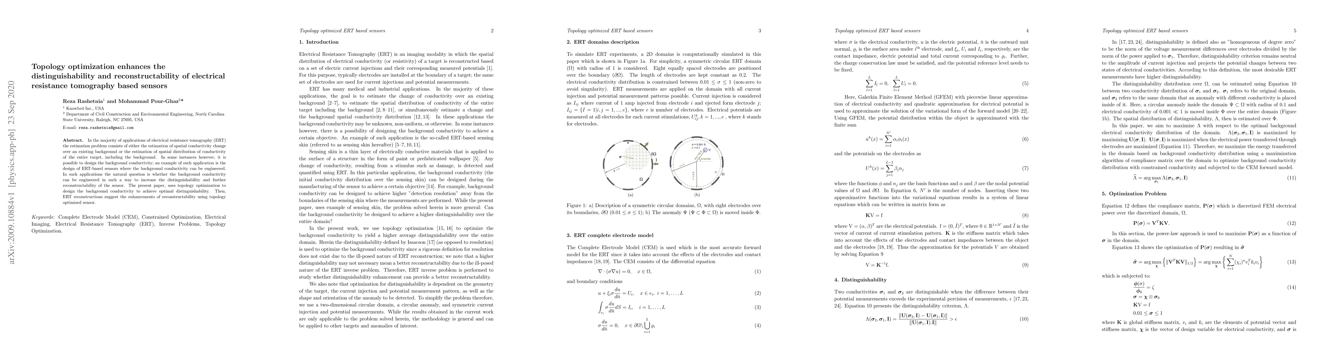 In the majority of applications of electrical resistance tomography (ERT) the estimation problem consists of either the estimation of spatial conductivity change over an existing background or the estimation of spatial distribution of conductivity of the entire target, including the background. In some instances however, it is possible to design the background conductivity; an example of such application is the design of ERT-based sensors where the background conductivity can be engineered. In such applications the natural question is whether the background conductivity can be engineered in such a way to increase the distinguishability and further reconstructability of the sensor. The present paper, uses topology optimization to design the background conductivity to achieve optimal distinguishability. Then, ERT reconstructions suggest the enhancements of reconstructability using topology optimized sensor.