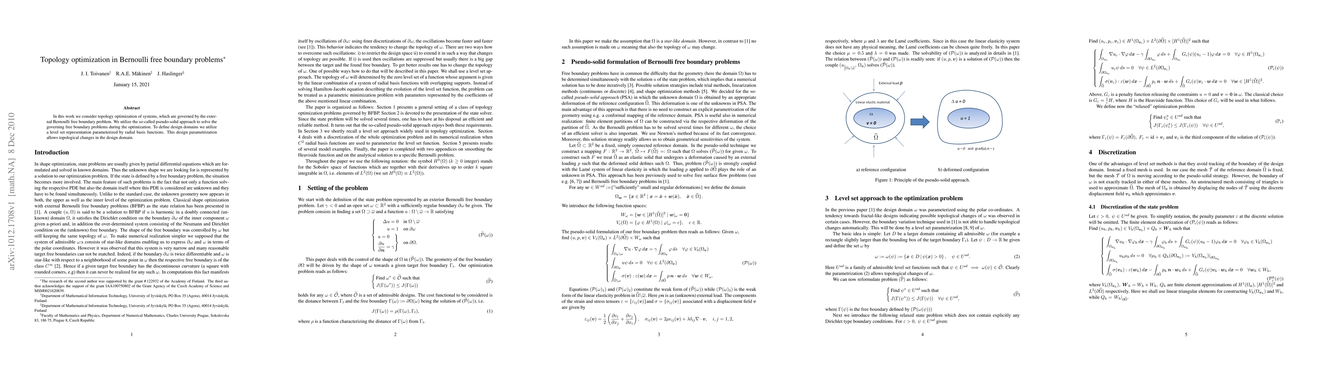 This research applies topology optimization to systems governed by Bernoulli free boundary problems using a pseudo-solid approach. It employs a level set representation with radial basis functions for design domain definition, enabling topological changes in the design.