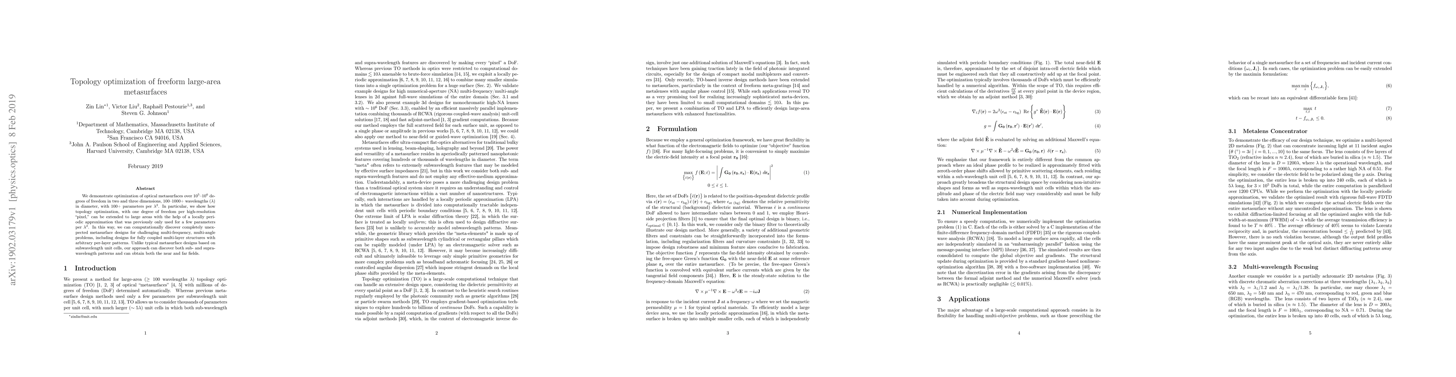 This research presents a method for optimizing large-scale optical metasurfaces with millions of degrees of freedom using topology optimization. By employing a locally periodic approximation, the technique discovers novel, unexpected designs for complex multi-frequency, multi-angle problems, including multi-layer structures. This approach can create both sub- and supra-wavelength patterns and calculate near and far fields, offering a significant departure from conventional subwavelength unit cell-based designs.