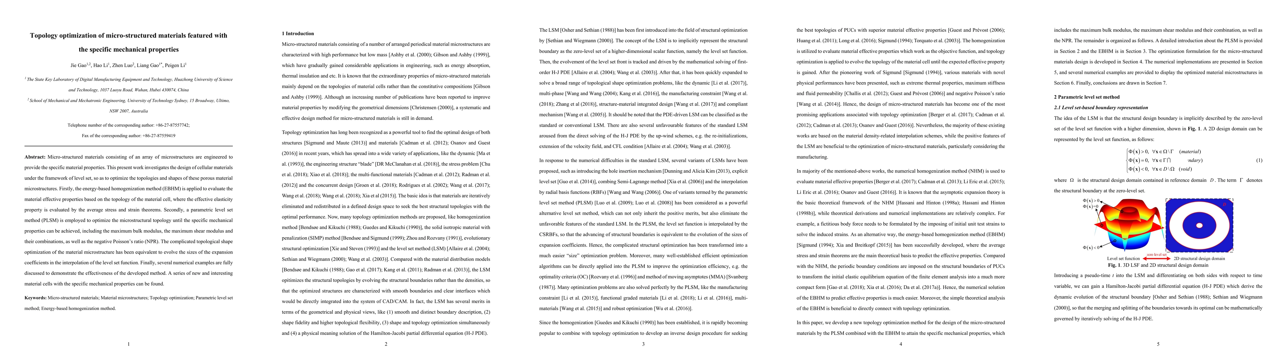 Researchers used a level set method to optimize the topologies of micro-structured materials for specific mechanical properties, achieving new material cells with desired bulk modulus, shear modulus, and Poisson's ratio.