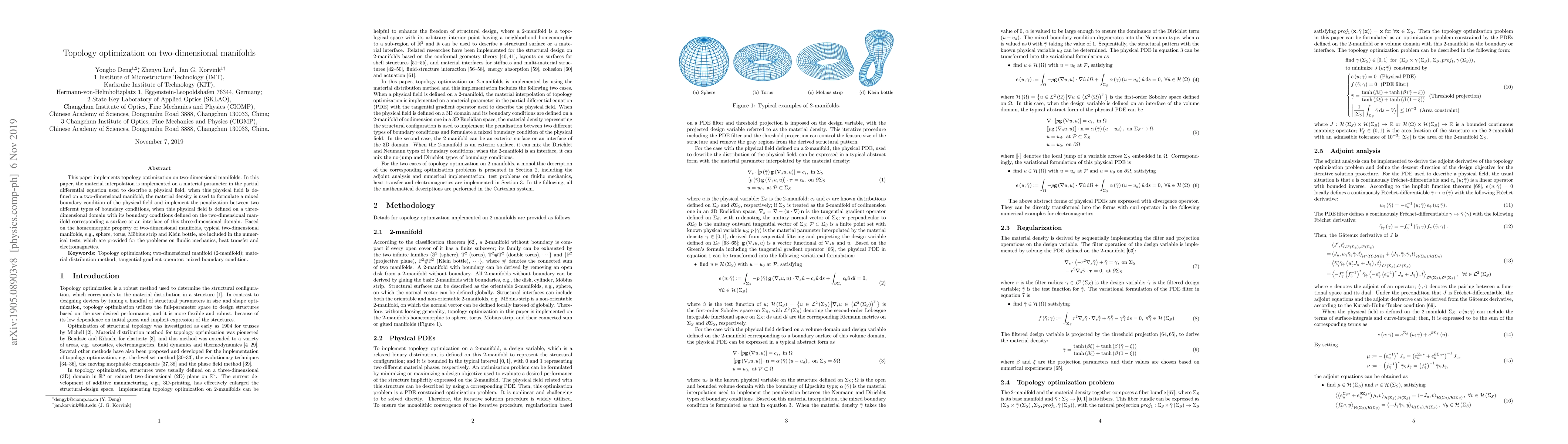 This paper applies topology optimization to 2D manifolds, exploring its application in fluid mechanics, heat transfer, and electromagnetics on various surfaces and interfaces.