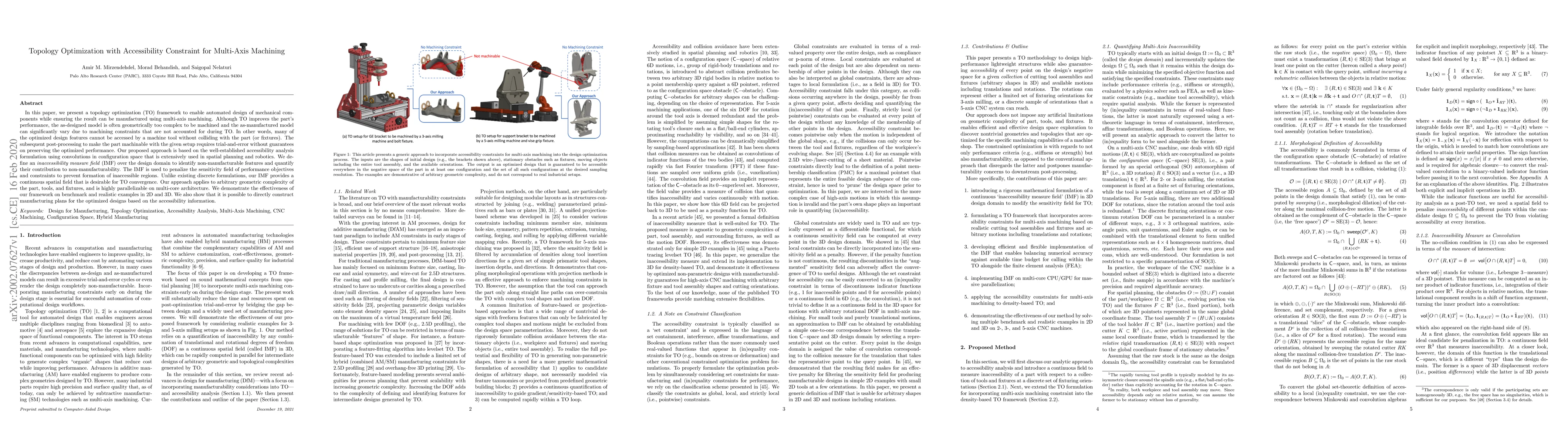 This paper proposes a topology optimization framework that integrates accessibility constraints to ensure mechanical components can be manufactured via multi-axis machining. It introduces an 'inaccessibility measure field' to penalize non-manufacturable features, enabling the design of optimized parts that are feasible to machine without compromising performance.