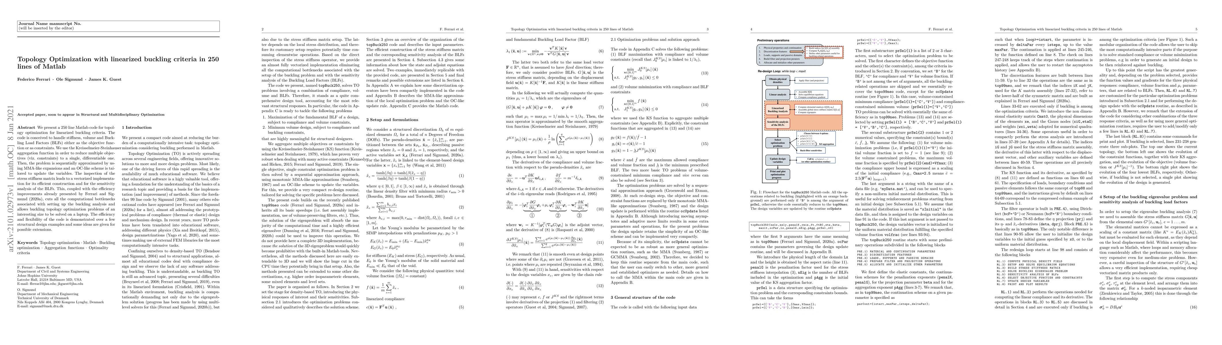 This paper presents a 250-line Matlab code for topology optimization under linearized buckling criteria, efficiently handling stiffness, volume, and Buckling Load Factors. It employs the Kreisselmeier-Steinhauser function for multi-objective optimization and uses vectorized implementations to enhance computational efficiency.