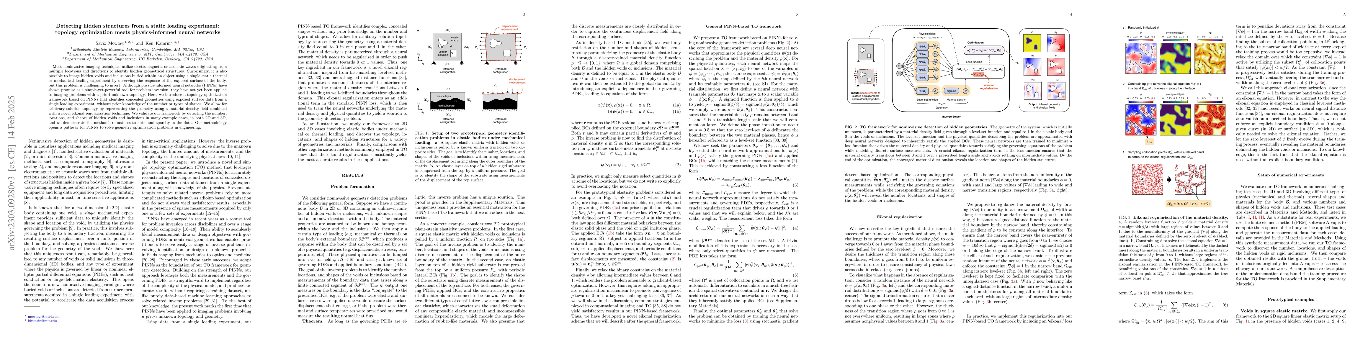 This paper introduces a topology optimization framework using physics-informed neural networks (PINNs) to noninvasively detect hidden geometries from surface measurements. The method represents geometry via a material density field, enabling detection of unknown shapes and voids in elastic bodies.