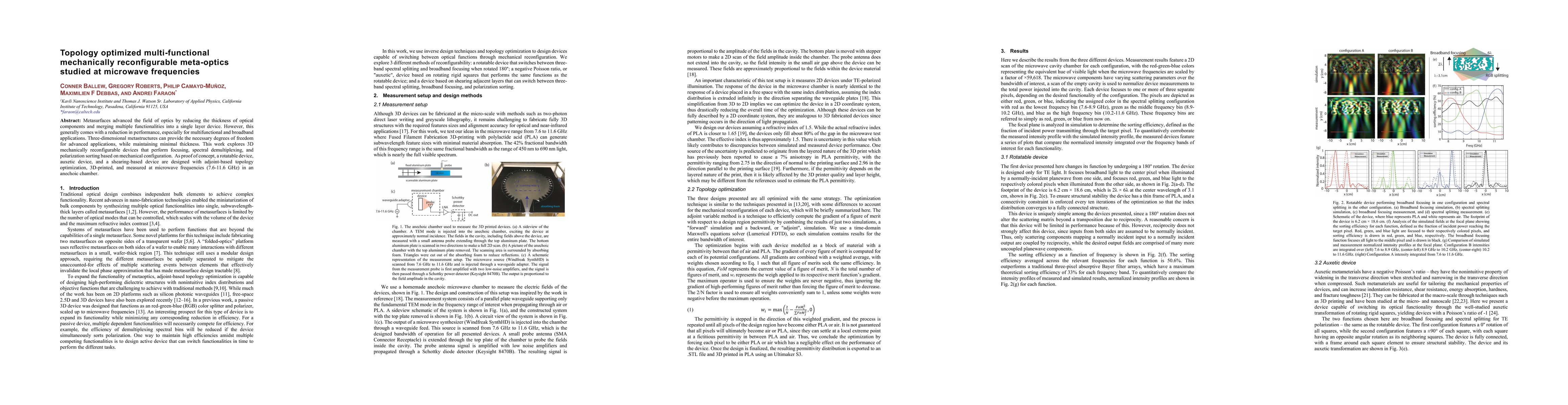 Metasurfaces advanced the field of optics by reducing the thickness of optical components and merging multiple functionalities into a single layer device. However, this generally comes with a reduction in performance, especially for multifunctional and broadband applications. Three-dimensional metastructures can provide the necessary degrees of freedom for advanced applications, while maintaining minimal thickness. This work explores 3D mechanically reconfigurable devices that perform focusing, spectral demultiplexing, and polarization sorting based on mechanical configuration. As proof of concept, a rotatable device, auxetic device, and a shearing-based device are designed with adjoint-based topology optimization, 3D-printed, and measured at microwave frequencies (7.6-11.6 GHz) in an anechoic chamber.