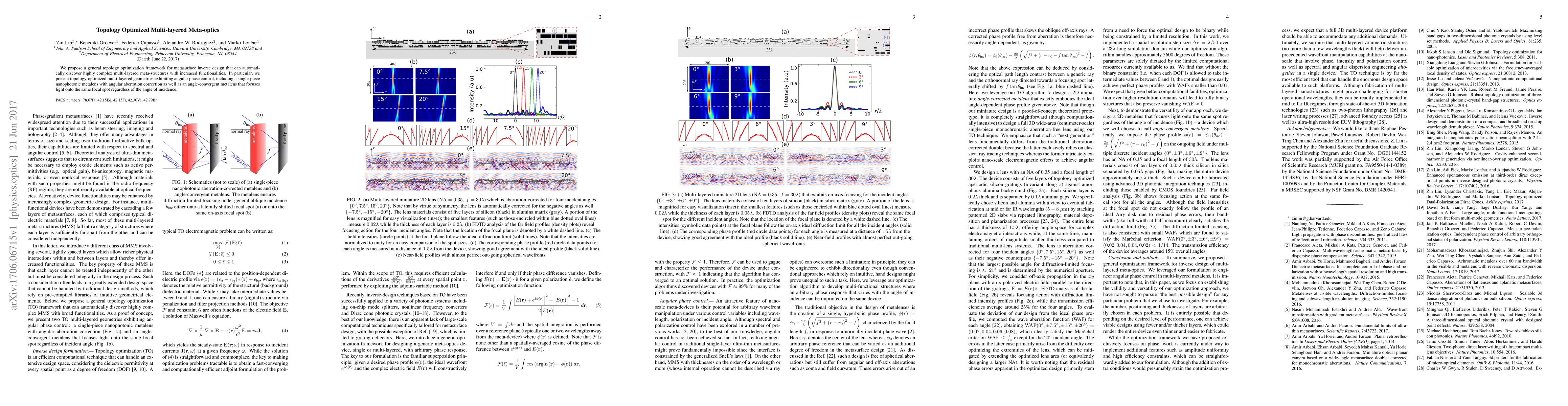 We propose a general topology optimization framework for metasurface inverse design that can automatically discover highly complex multi-layered meta-structures with increased functionalities. In particular, we present topology-optimized multi-layered geometries exhibiting angular phase control, including a single-piece nanophotonic metalens with angular aberration correction as well as an angle-convergent metalens that focuses light onto the same focal spot regardless of the angle of incidence.