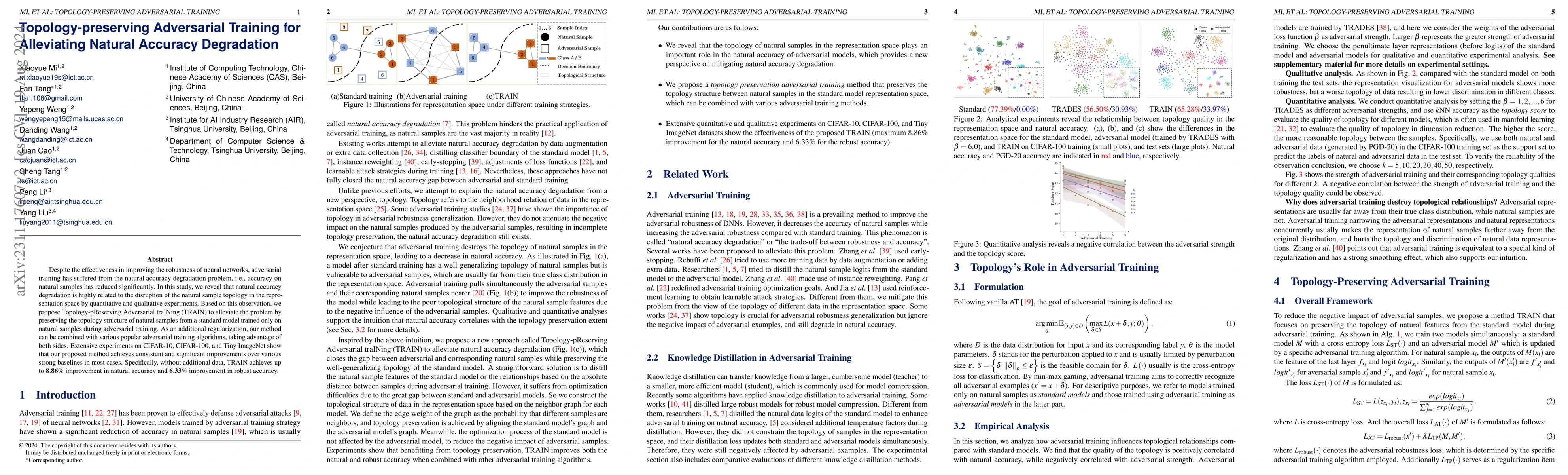 This paper proposes Topology-Preserving Adversarial Training (TRAIN) to mitigate the accuracy degradation issue in adversarial training by preserving the natural sample topology in the representation space. The method achieves significant improvements in both natural and robust accuracy on CIFAR-10, CIFAR-100, and Tiny ImageNet datasets.