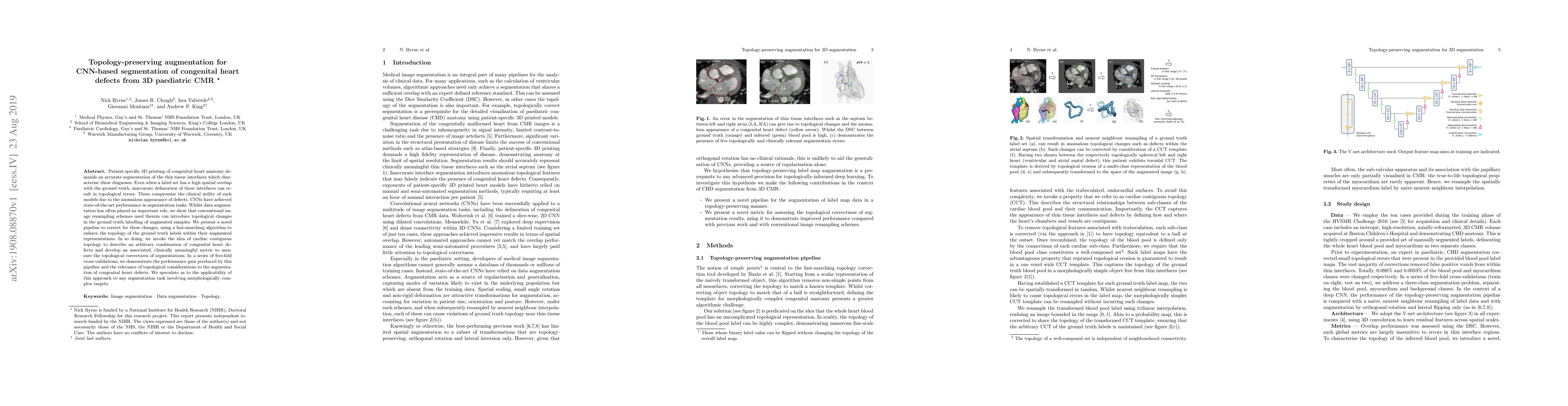 This paper proposes a novel topology-preserving augmentation method for CNN-based segmentation of congenital heart defects in 3D paediatric CMR images, addressing the issue of topological errors caused by conventional augmentation techniques. The method uses a fast-marching algorithm to maintain the ground truth topology, demonstrating improved segmentation performance in cross-validations.