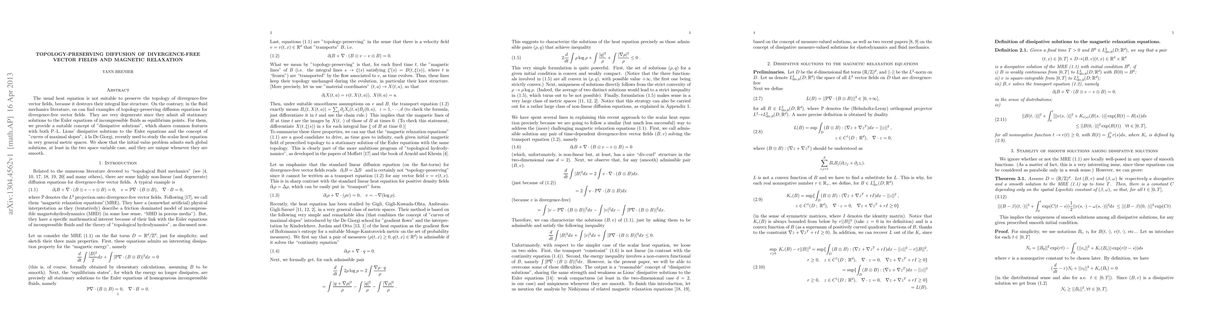This paper develops a topology-preserving diffusion equation for divergence-free vector fields, ensuring the preservation of integral line structure unlike the standard heat equation. It introduces "dissipative solutions" that align with established concepts from fluid mechanics and scalar heat equations in metric spaces.