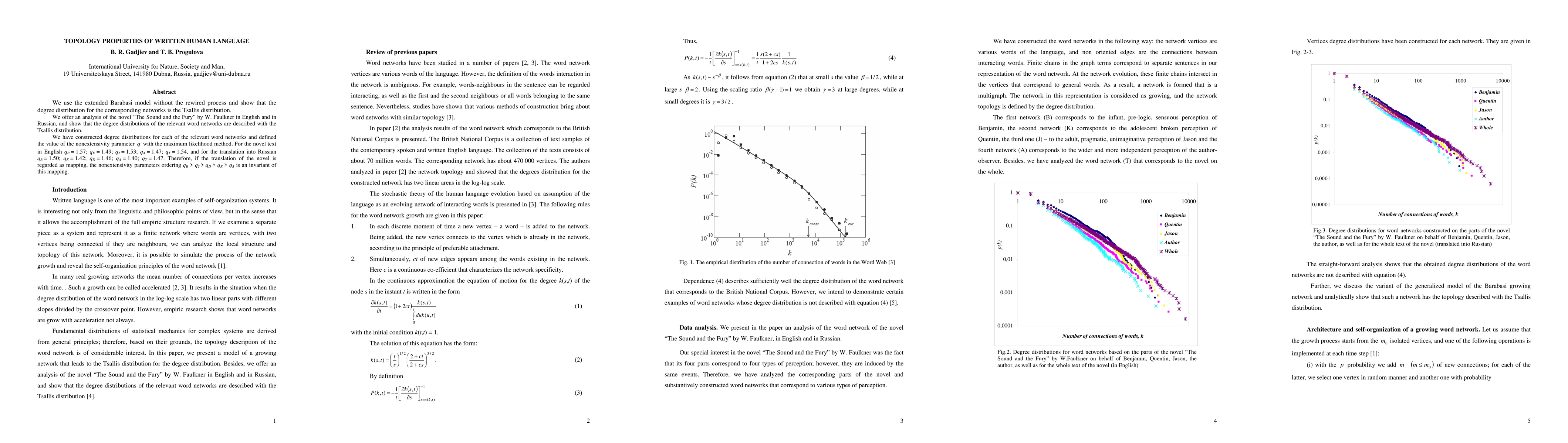 We use the extended Barabasi model without the rewired process and show that the degree distribution for the corresponding networks is the Tsallis distribution. We offer an analysis of the novel "The Sound and the Fury" by W. Faulkner in English and in Russian, and show that the degree distributions of the relevant word networks are described with the Tsallis distribution. We have constructed degree distributions for each of the relevant word networks and defined the value of the nonextensivity parameter with the maximum likelihood method. For the novel text in English qB = 1.57; qK = 1.49; qJ = 1.53; qA = 1.47; qT = 1.54, and for the translation into Russian qB = 1.50; qK = 1.42; qD = 1.46; qA = 1.40; qT = 1.47. Therefore, if the translation of the novel is regarded as mapping, the nonextensivity parameters ordering qB > qT > qD > qK > qA is an invariant of this mapping.