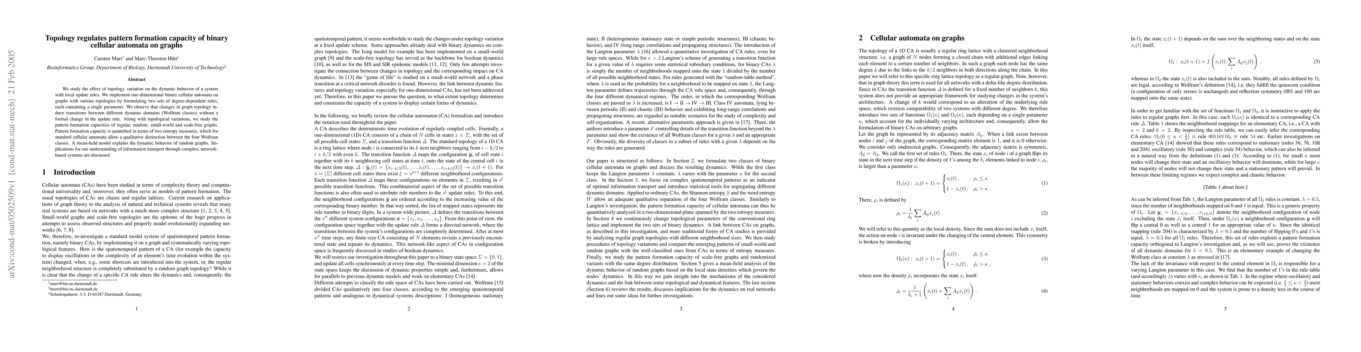 This paper investigates how varying the topology of graphs influences the dynamic behavior of one-dimensional binary cellular automata, revealing transitions between different dynamic domains without altering the update rules. It quantifies pattern formation capacity using entropy measures and discusses implications for information transport in complex network systems.