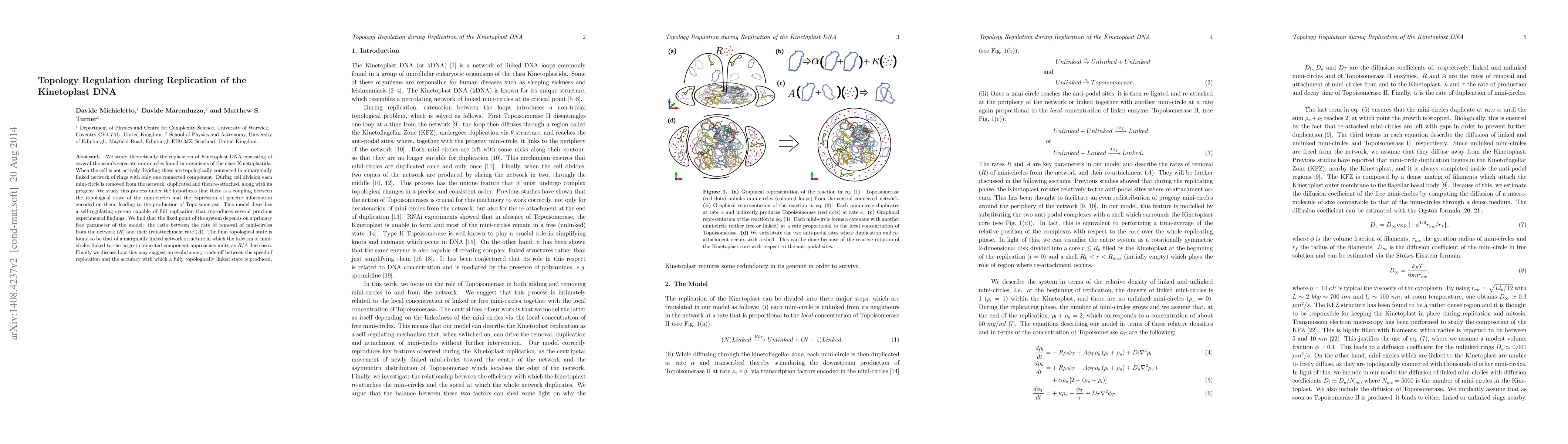 The study models how Kinetoplast DNA replicates in a marginally linked network structure, with the topological state depending on the ratio of mini-circle removal to reattachment rates. The model suggests an evolutionary trade-off between replication speed and accuracy.