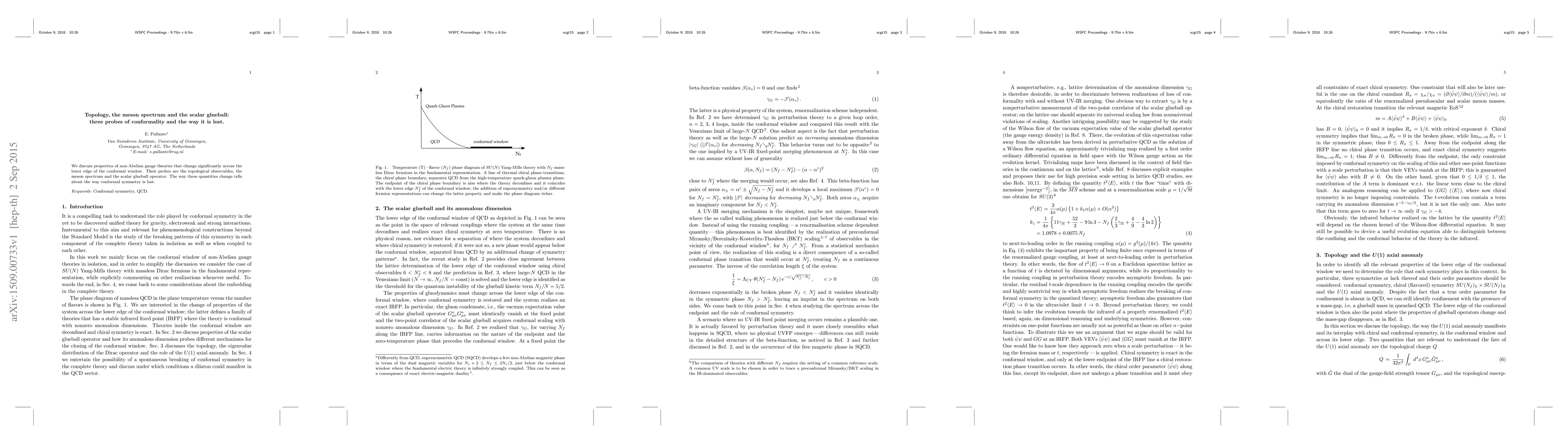 Researchers investigate how conformal symmetry is lost in non-Abelian gauge theories using topological observables, meson spectrum, and scalar glueball operator as probes. Their findings shed light on the properties of these theories across the lower edge of the conformal window.