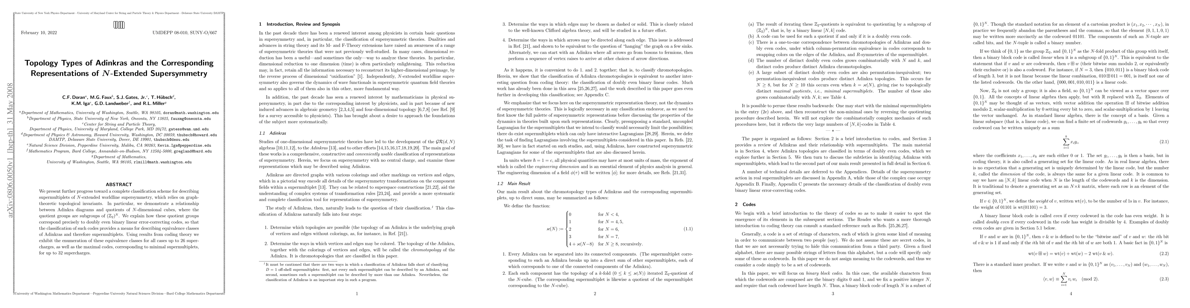 We present further progress toward a complete classification scheme for describing supermultiplets of N-extended worldline supersymmetry, which relies on graph-theoretic topological invariants. In particular, we demonstrate a relationship between Adinkra diagrams and quotients of N-dimensional cubes, where the quotient groups are subgroups of $(Z_2)^N$. We explain how these quotient groups correspond precisely to doubly even binary linear error-correcting codes, so that the classification of such codes provides a means for describing equivalence classes of Adinkras and therefore supermultiplets. Using results from coding theory we exhibit the enumeration of these equivalence classes for all cases up to 26 supercharges, as well as the maximal codes, corresponding to minimal supermultiplets, for up to 32 supercharges.