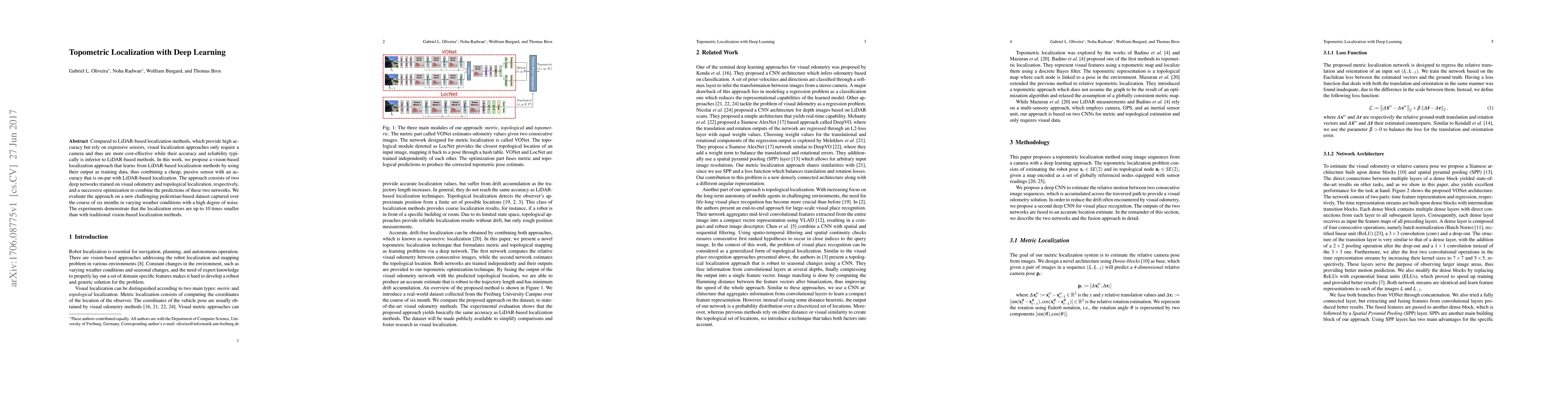This research introduces a vision-based localization method that matches LiDAR's accuracy using deep learning. It trains two networks on visual odometry and topological localization, then combines their predictions. Evaluated on a diverse dataset, it shows localization errors up to 10 times smaller than traditional vision-based methods.