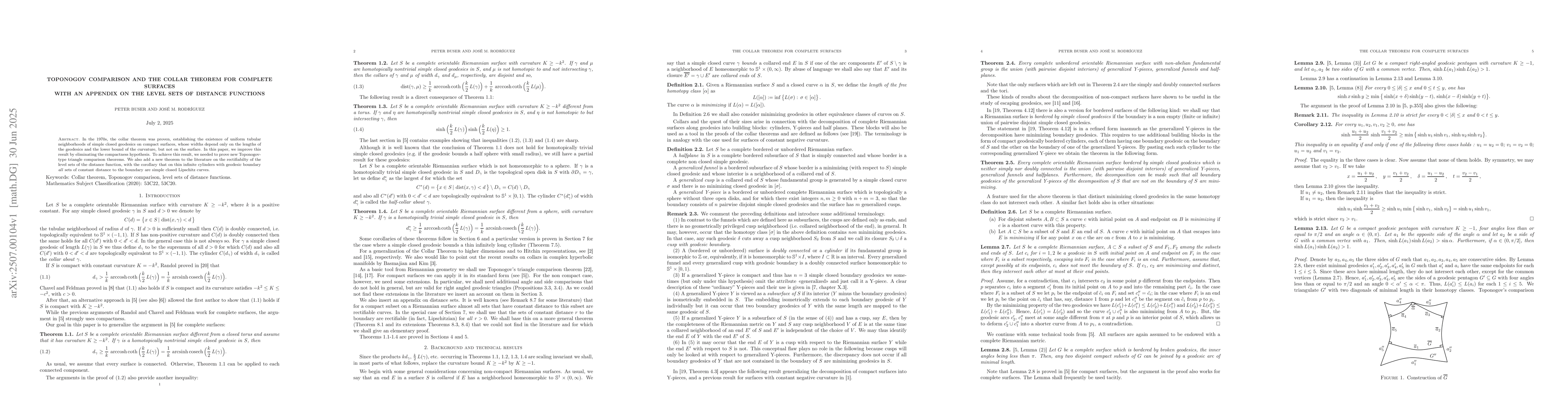 The paper employs geometric and analytical techniques, specifically Toponogov comparison theorems and distance function analysis, to extend the collar theorem for complete surfaces.