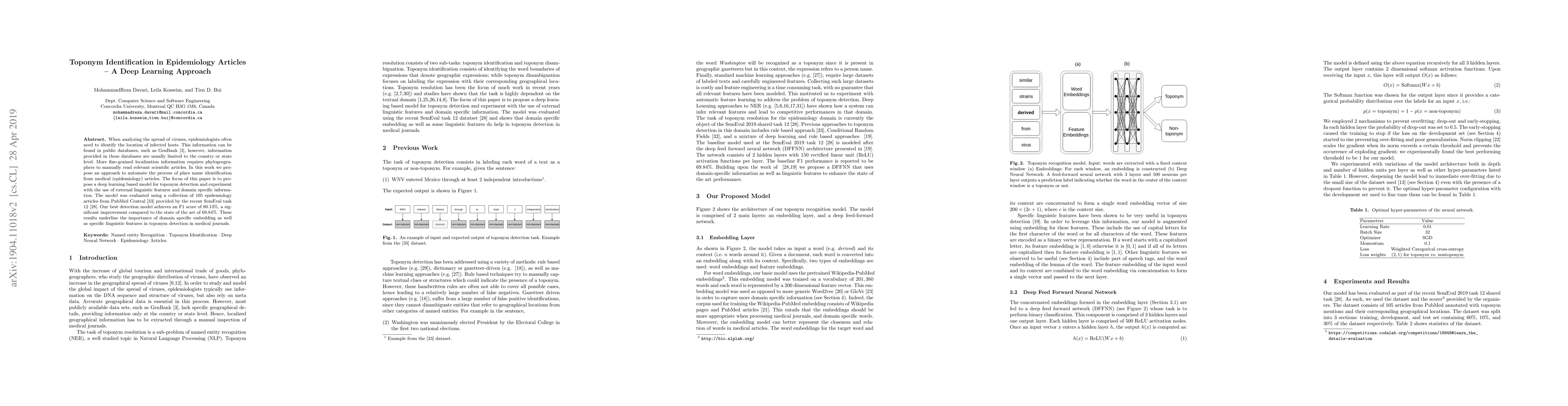 When analyzing the spread of viruses, epidemiologists often need to identify the location of infected hosts. This information can be found in public databases, such as GenBank, however, information provided in these databases are usually limited to the country or state level. More fine-grained localization information requires phylogeographers to manually read relevant scientific articles. In this work we propose an approach to automate the process of place name identification from medical (epidemiology) articles. The focus of this paper is to propose a deep learning based model for toponym detection and experiment with the use of external linguistic features and domain specific information. The model was evaluated using a collection of 105 epidemiology articles from PubMed Central provided by the recent SemEval task 12. Our best detection model achieves an F1 score of $80.13\%$, a significant improvement compared to the state of the art of $69.84\%$. These results underline the importance of domain specific embedding as well as specific linguistic features in toponym detection in medical journals.