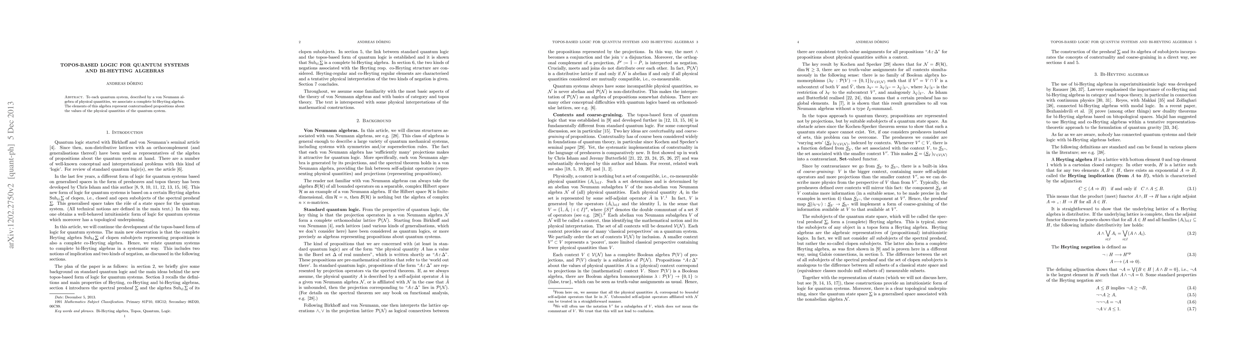 This paper associates a complete bi-Heyting algebra with each quantum system, represented by a von Neumann algebra, to model contextualised propositions about physical quantities. The bi-Heyting algebra provides a logical framework for reasoning about quantum systems.